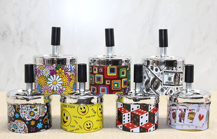 Küçük boy metal renkli basmalı küllük, 12x7.5 cm boyutuyla hem kompakt hem de şık bir kullanım sunar. Renkli ve eğlenceli desenleriyle dikkat çeken bu küllük, basmalı mekanizması sayesinde sigara izmaritlerini kolayca içine hapseder ve kötü kokuların yayılmasını önler. Metal malzemesi dayanıklılığı artırırken, yuvarlak formu modern bir görünüm kazandırır. Ev, ofis veya açık alanlarda rahatlıkla kullanılabilir. Temizliği kolaydır ve uzun ömürlü bir kullanım sağlar.