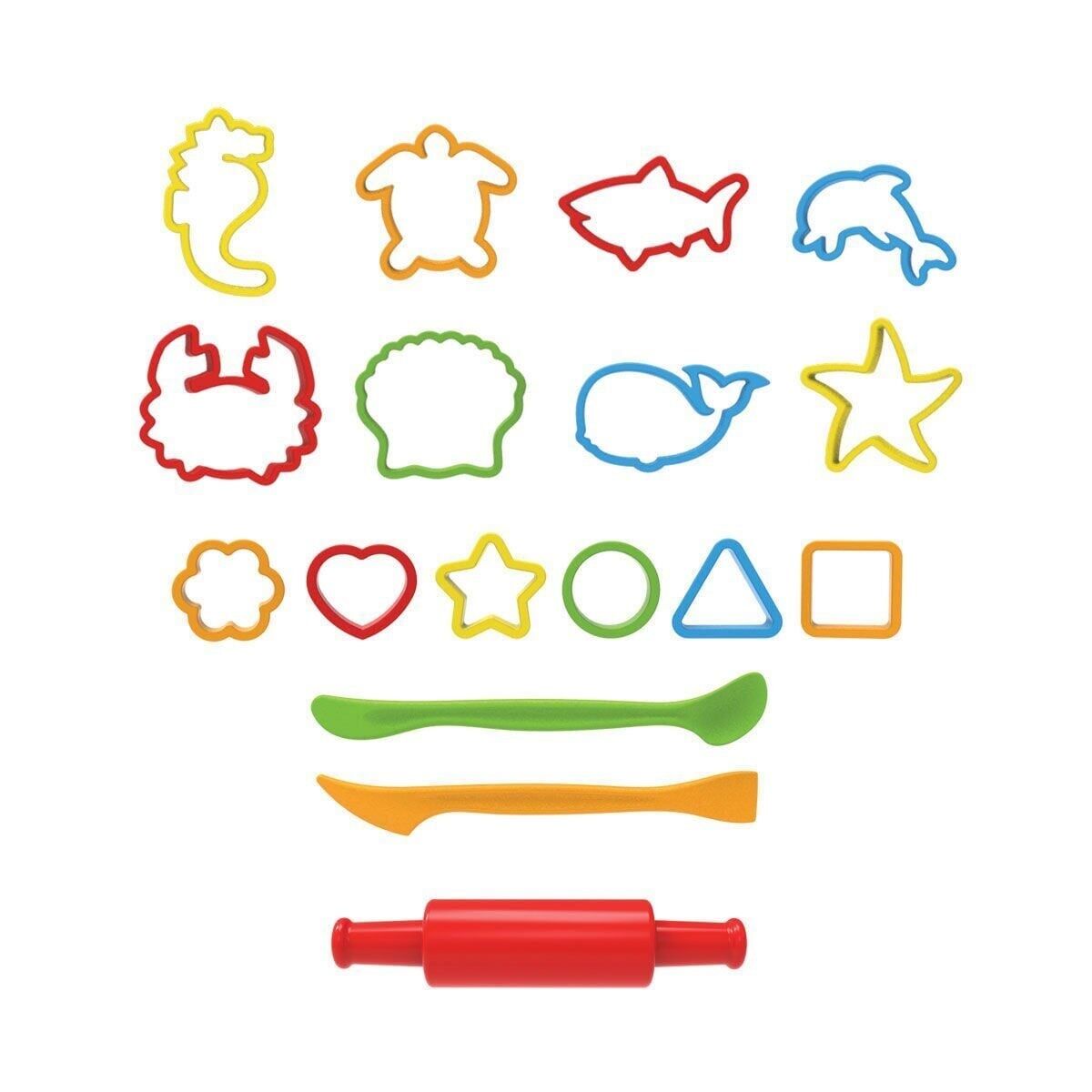 Ürün; 8 adet deniz hayvanları kalıbı, 6 adet geometrik kalıp, 2 adet bıcak ve 1 adet merdaneden oluşmaktadır.