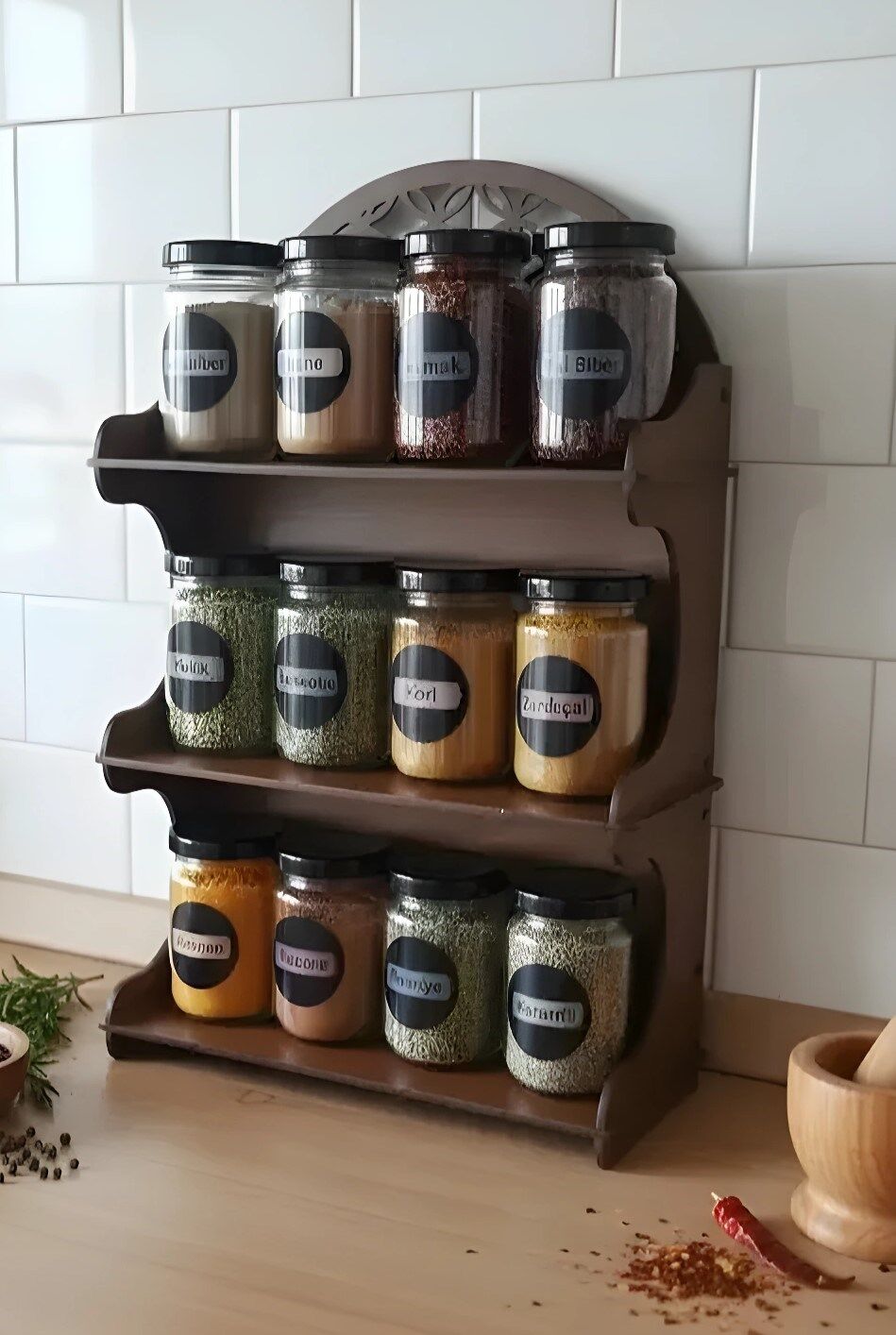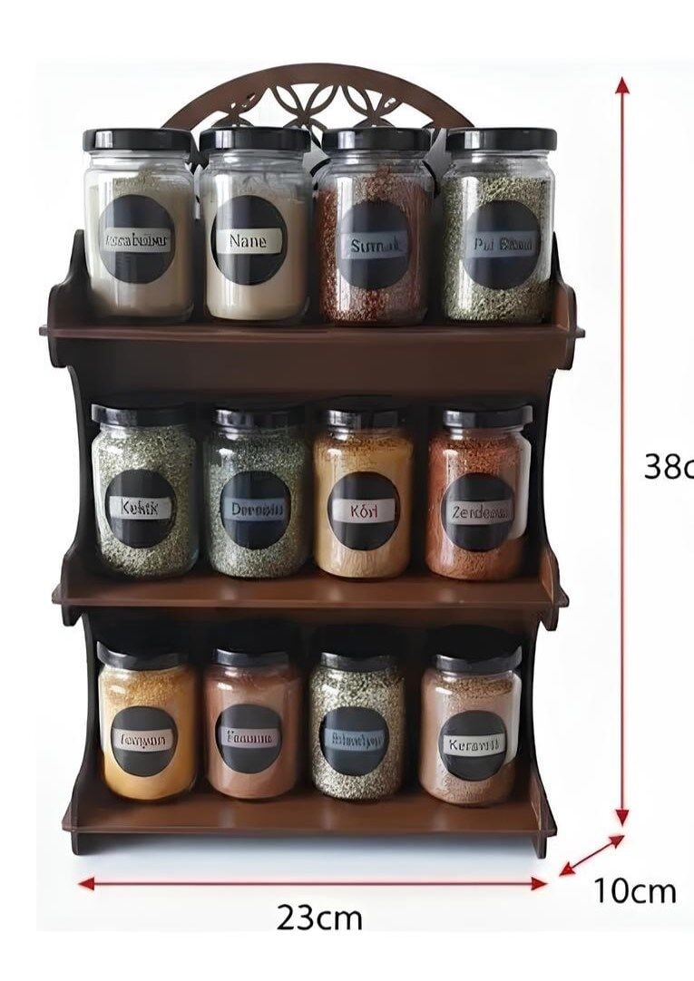 12’li Cam Kavanozlu Dekoratif MDF Standlı Baharatlık Seti | Ceviz Tonu | Siyah Metal Kapaklı