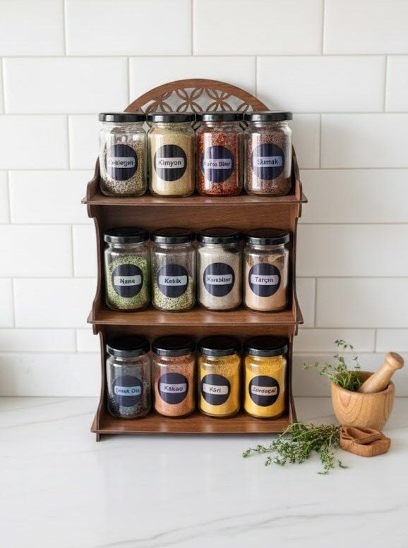 Mutfağınızda düzen ve şıklığı bir araya getiren meşe tonlarında ahşap görünümlü dekoratif MDF standlı 12’li baharatlık seti, cam kavanozları ve modern tasarımıyla tezgâhınıza estetik bir görünüm kazandırır. Günlük kullanım için ideal ölçülerde tasarlanmış olup hem dekoratif hem işlevsel bir çözüm sunar.