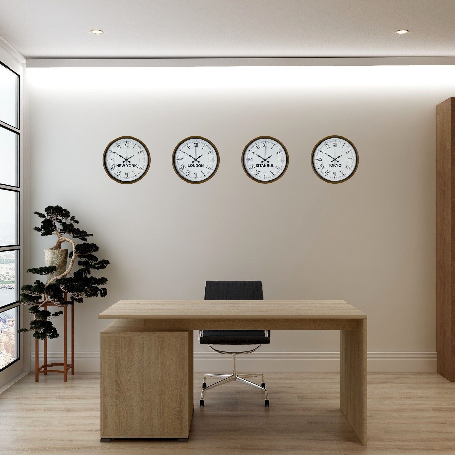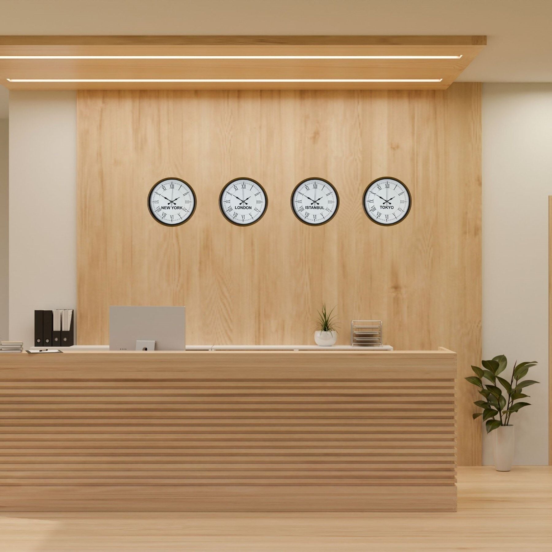 New York, London, Istanbul ve Tokyo şehirlerinin saatlerini aynı anda takip etmenizi sağlayan bu özel set; oteller, resepsiyonlar, ofisler ve uluslararası çalışan işletmeler için hem dekoratif hem de profesyonel bir çözüm sunar.