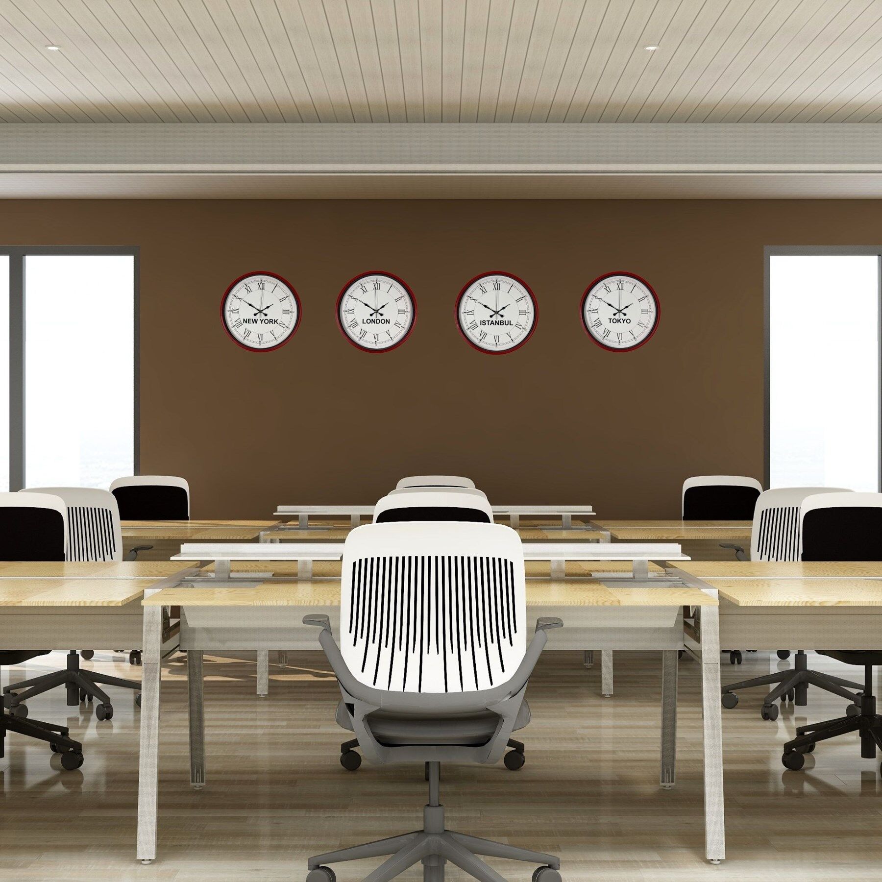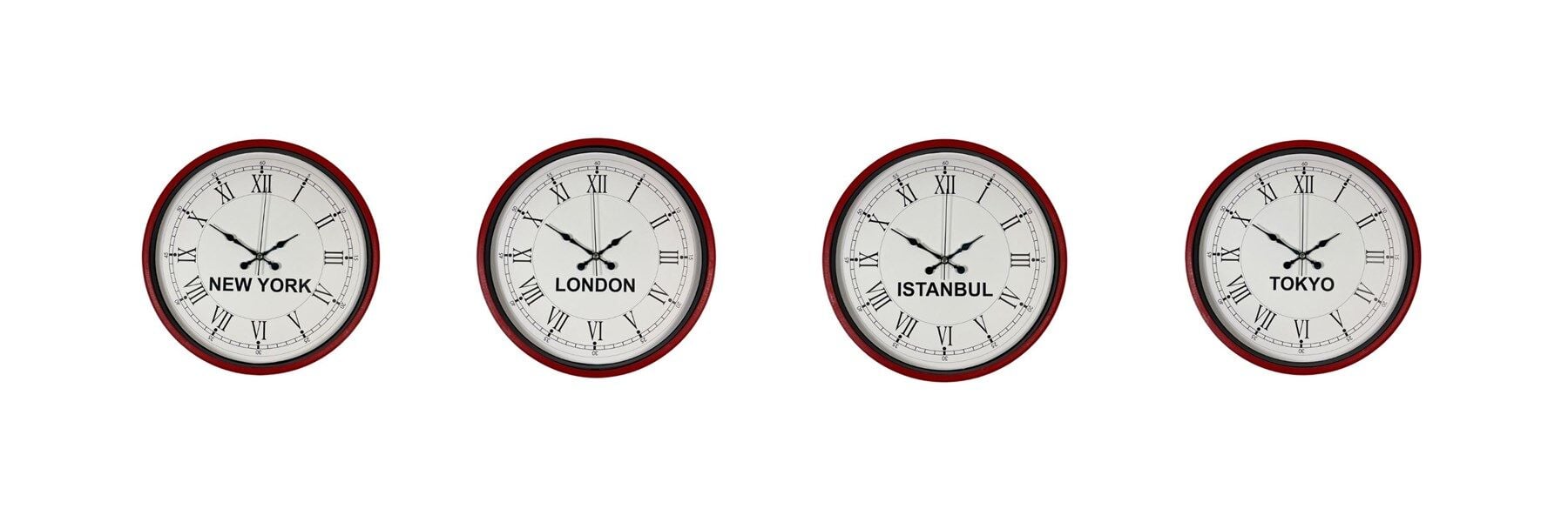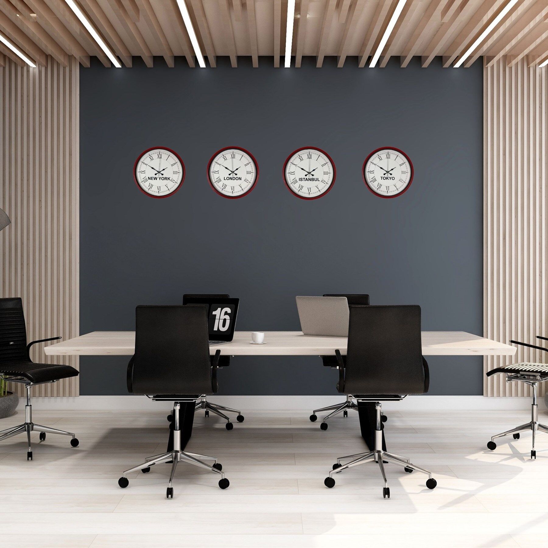New York, London, Istanbul ve Tokyo saatlerini aynı anda takip etmenizi sağlayan bu özel set; oteller, resepsiyonlar, ofisler ve uluslararası çalışan işletmeler için hem dekoratif hem de profesyonel bir çözümdür.