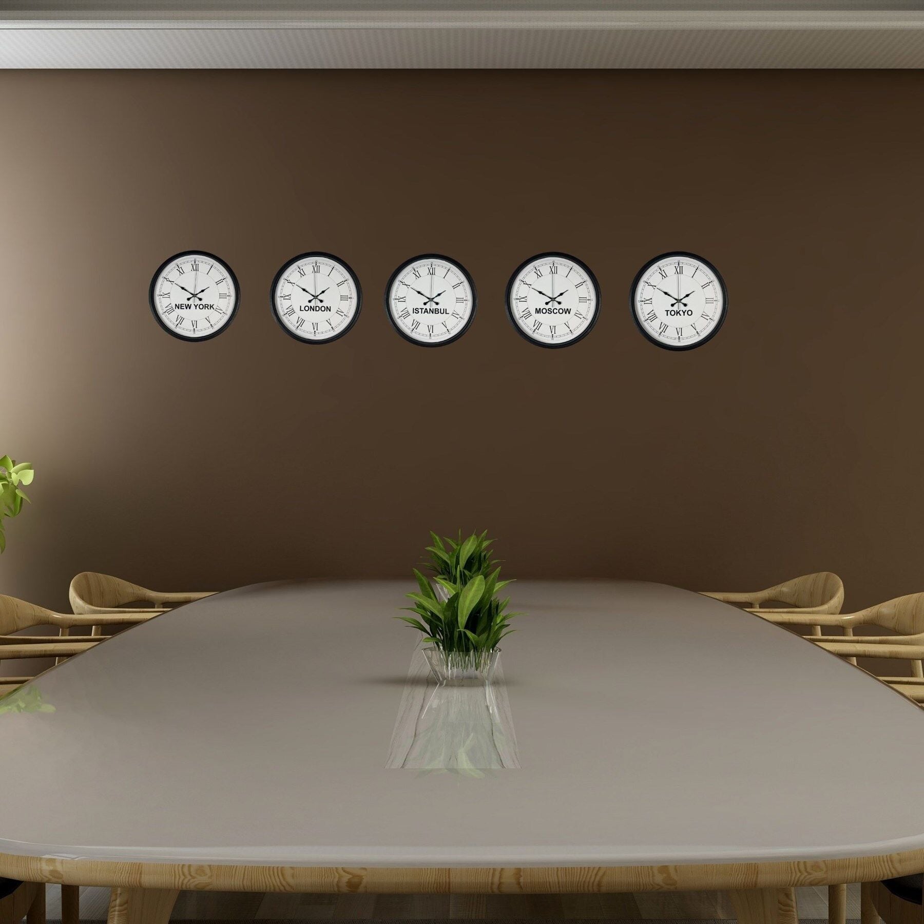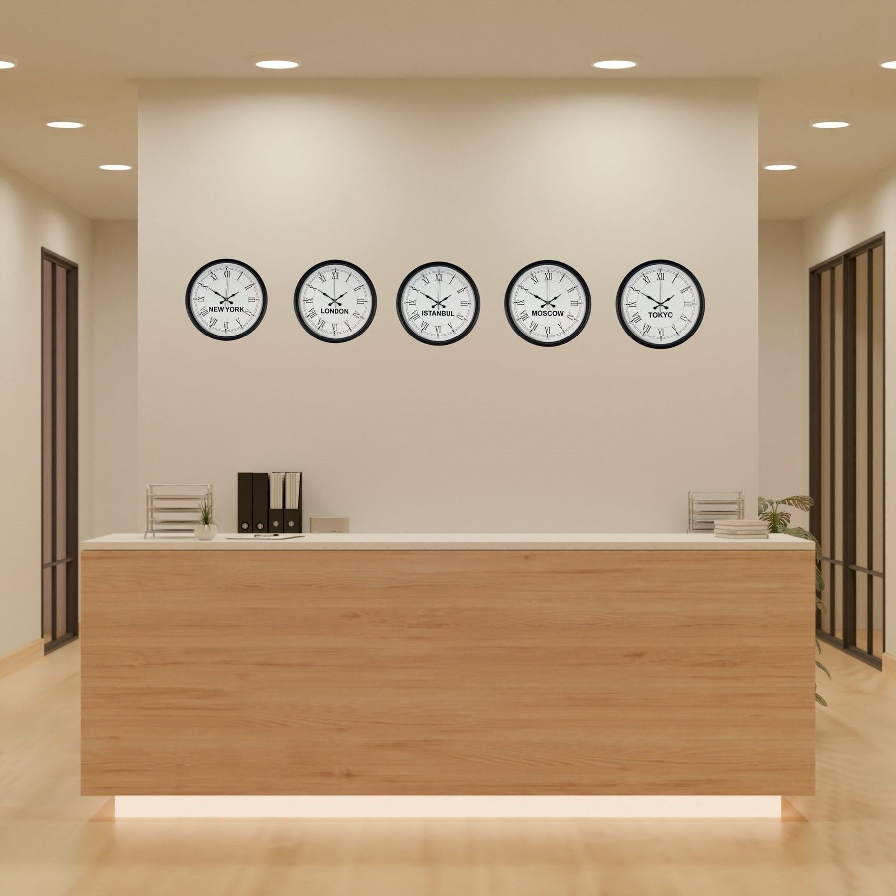 5 farklı zaman dilimini tek duvarda sunarak global zaman yönetimini kolaylaştırır. Roma rakamlı klasik kadran tasarımı ürüne prestijli bir hava katarken, siyah kasa detayı güçlü ve kurumsal bir görünüm oluşturur.