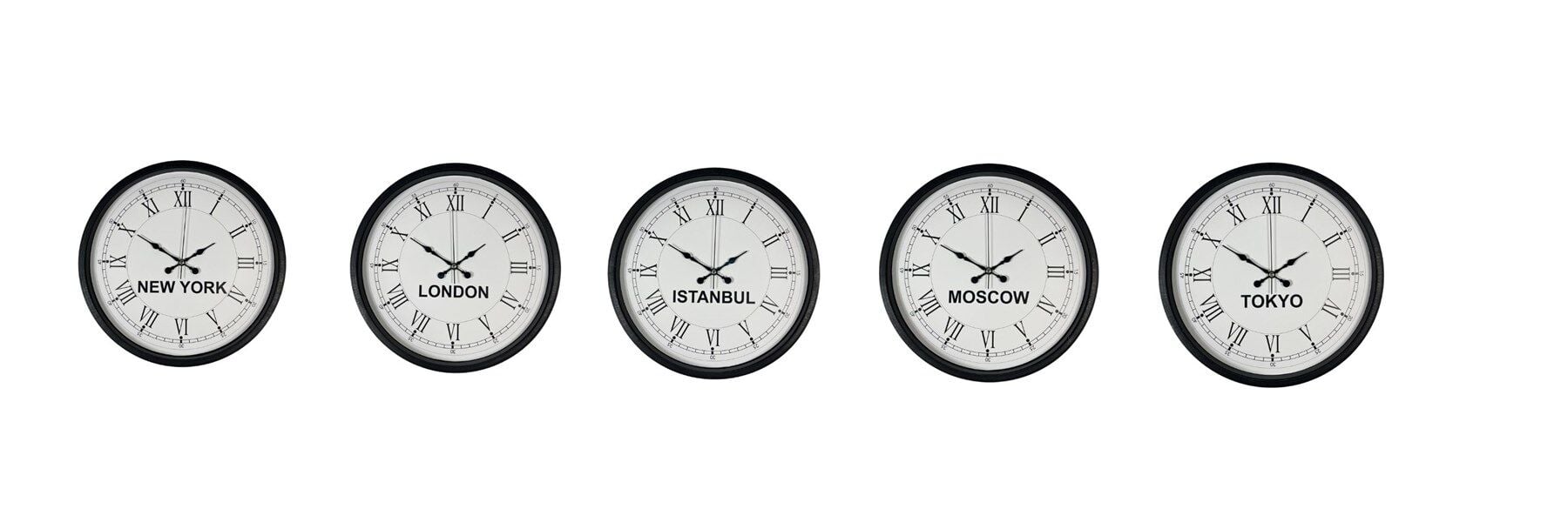 New York, London, Istanbul, Moscow ve Tokyo şehirlerinin saatlerini aynı anda takip etmenizi sağlayan bu özel set; oteller, resepsiyon alanları, ofisler ve uluslararası çalışan işletmeler için hem dekoratif hem de fonksiyonel bir çözümdür.