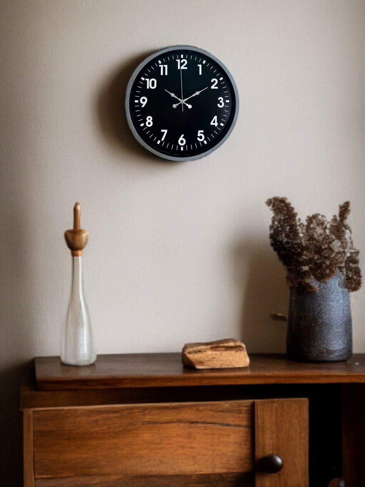 Siyah kadranı, kontrast oluşturan beyaz rakamları ve gri çerçevesiyle tasarlanan bu 36 cm duvar saati; modern, sade ve güçlü bir duruş sunar. Net rakam yapısı sayesinde uzaktan bile kolayca okunur ve günlük kullanımda pratiklik sağlar.