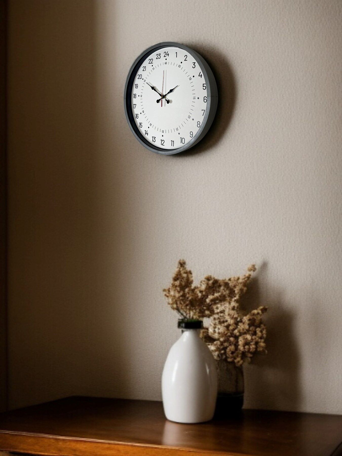 Klasik duvar saatlerinden ayrılan 24 saat göstergeli özel kadranı ile bu model, günün tamamını tek bir kadranda görmenizi sağlar. Standart 12 saatlik saatlerden farklı olarak 01–24 sistemini kullandığı için özellikle düzenli zaman takibi isteyenler için daha pratik ve sıradışı bir kullanım sunar.