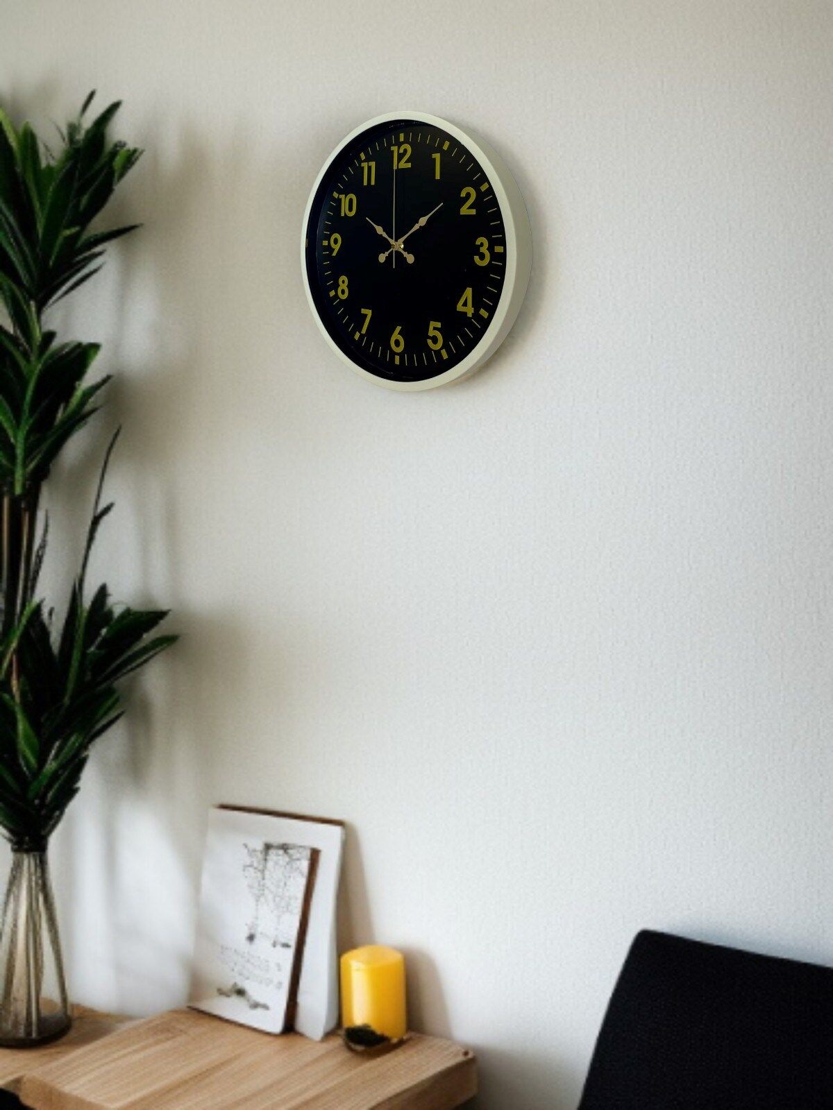 Krem renkli çerçevesi ile koyu zemin üzerindeki gold tonlu rakamları ve zarif akrep-yelkovan tasarımı sayesinde bu 36 cm duvar saati, bulunduğu ortama klasik ve sofistike bir hava katar. Net ve dengeli kadran yapısı, saatin her açıdan rahatlıkla okunmasını sağlar. Hem modern hem de klasik dekorasyon stilleriyle uyumlu, zamansız bir tasarıma sahiptir.
