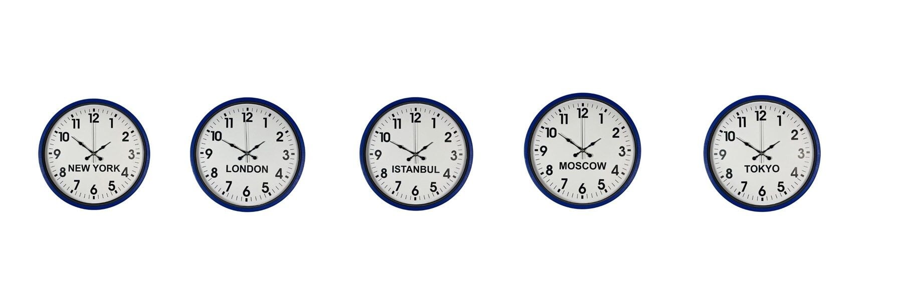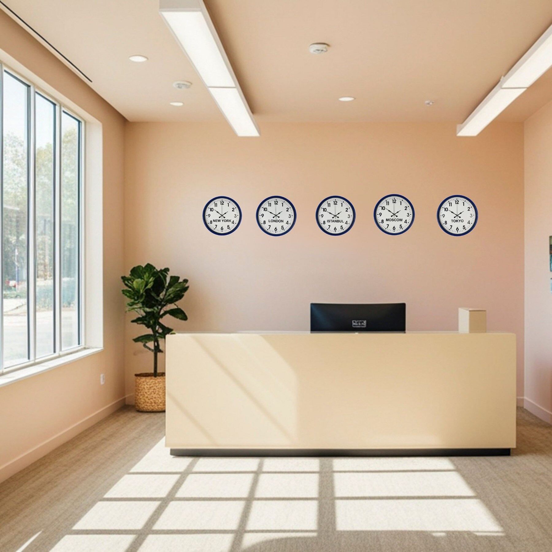 New York, London, Istanbul, Moscow ve Tokyo şehirlerinin saatlerini aynı anda takip etmenizi sağlayan bu özel set; oteller, resepsiyon alanları, ofisler ve uluslararası çalışan işletmeler için ideal bir çözümdür.