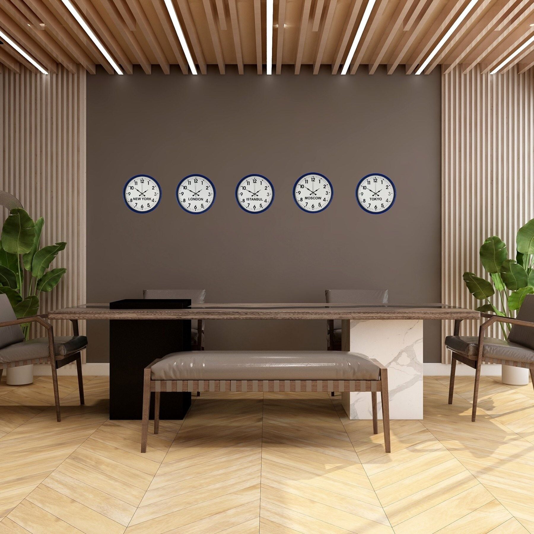 5 farklı zaman dilimini tek duvarda sunarak global zaman yönetimini kolaylaştırır. Özellikle uluslararası iş yapan firmalar için pratik kullanım sunarken, aynı zamanda dekoratif olarak mekana prestij kazandırır.