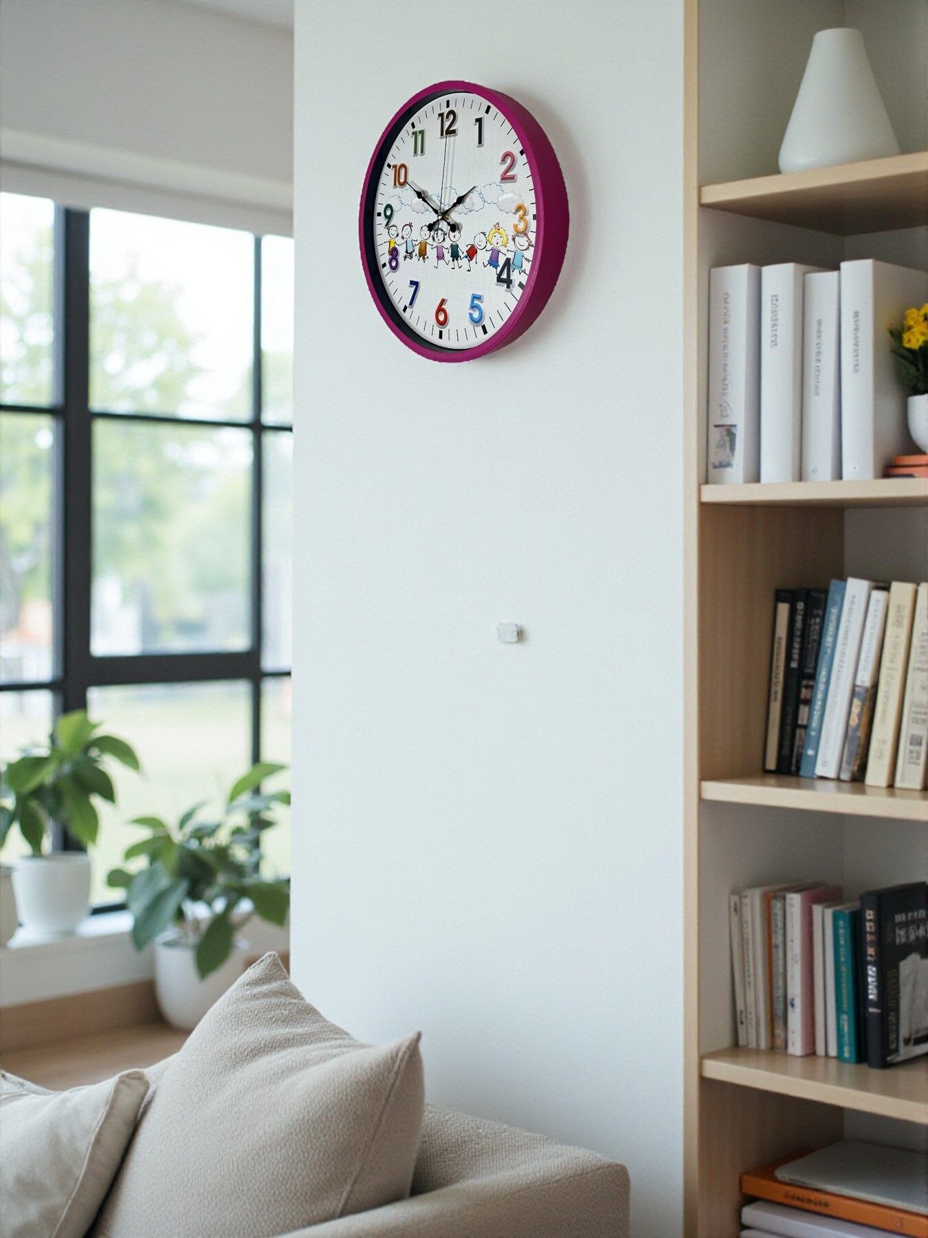 Canlı pembe çerçevesi, renkli rakamları ve sevimli çocuk figürleriyle tasarlanan bu 36 cm çocuk odası duvar saati, çocukların odasına neşe ve sıcak bir atmosfer kazandırır. Eğlenceli tasarımı sayesinde çocukların saat kavramını öğrenmesini desteklerken, odanın dekorasyonuna da enerjik bir dokunuş ekler.