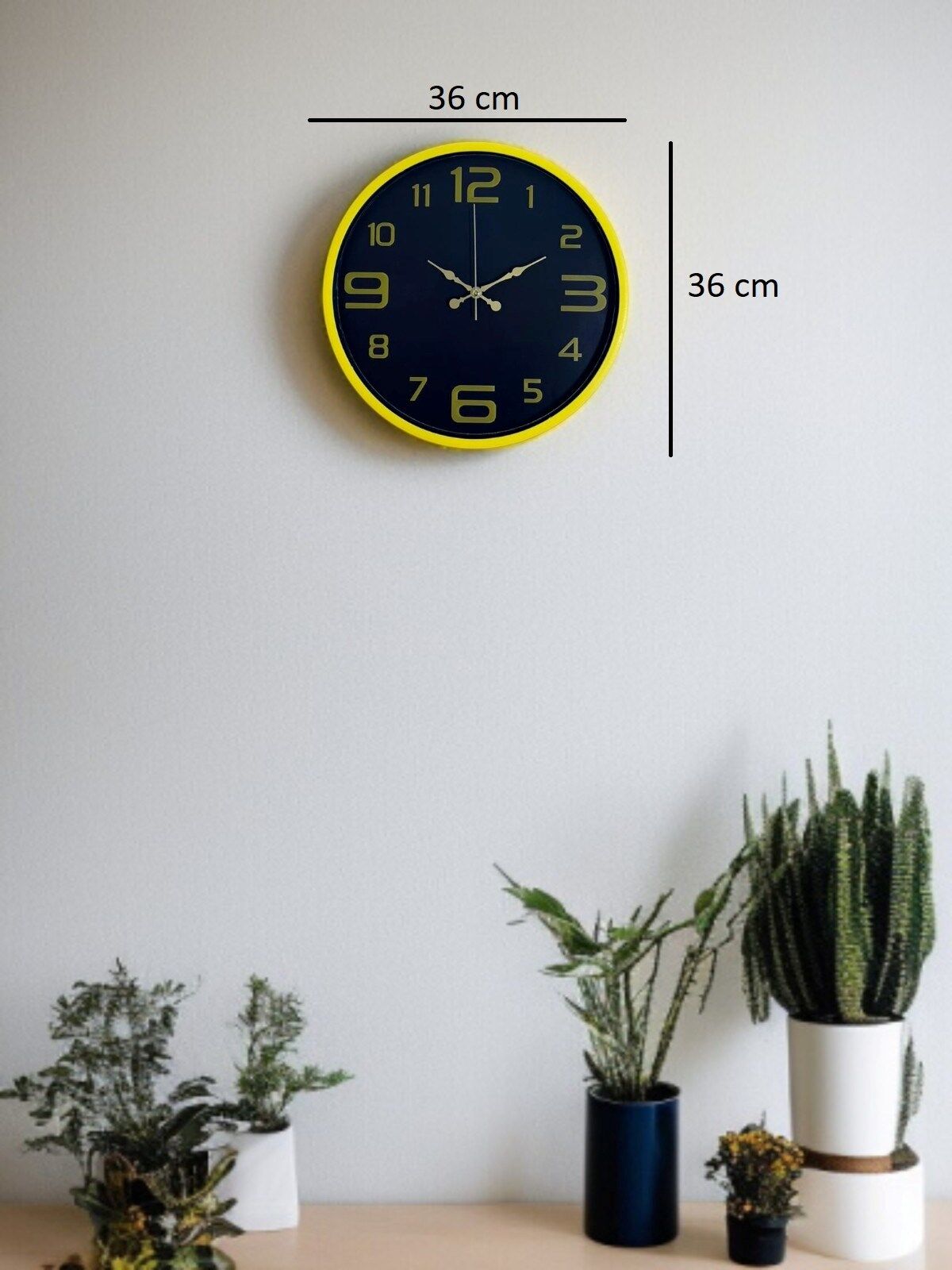 Canlı sarı çerçevesi ve koyu renk kadran tasarımıyla öne çıkan bu 36 cm duvar saati, bulunduğu ortama enerji ve modern bir karakter kazandırır. Altın tonlu rakamları ve kontrastlı kadran yapısı sayesinde saati uzaktan bile rahatlıkla okumak mümkündür.