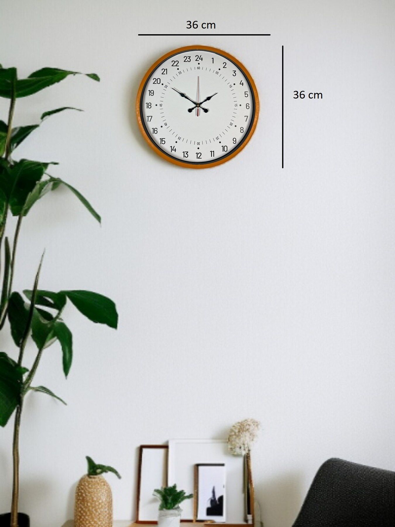 Standart 12 saatlik sistemden farklı olarak 24 saatlik zaman düzenine göre tasarlanan bu 36 cm turuncu duvar saati, günün tamamını tek turda takip etme imkânı sunar. Beyaz kadranı üzerinde yer alan 1–24 arası rakamlar sayesinde zaman daha net ve sistemli şekilde okunur.