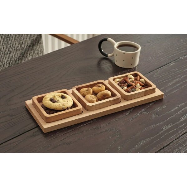 3'LÜ SUNUMLUK SETİÜrün Özellikleri3'lü Sunumluk Seti, şık ve modern tasarımı ile çay saatleri, kahvaltılar, davetler ve atıştırmalık sunumları için idealdir. Ahşap malzemeden üretilmiştir ve kimyasal madde içermez, sağlığa zararsızdır. Set, 3 adet kare sunum kasesi ve 1 adet uzun sunum tahtasından oluşur. Şık ve minimalist tasarımıyla mutfağınıza doğal bir hava katar. Gıda ile temas edebilir, hijyeniktir ve temizliği kolaydır. Kuruyemiş, çerez, lokum, çikolata, kurabiye gibi atıştırmalıklar için kullanıma uygundur.