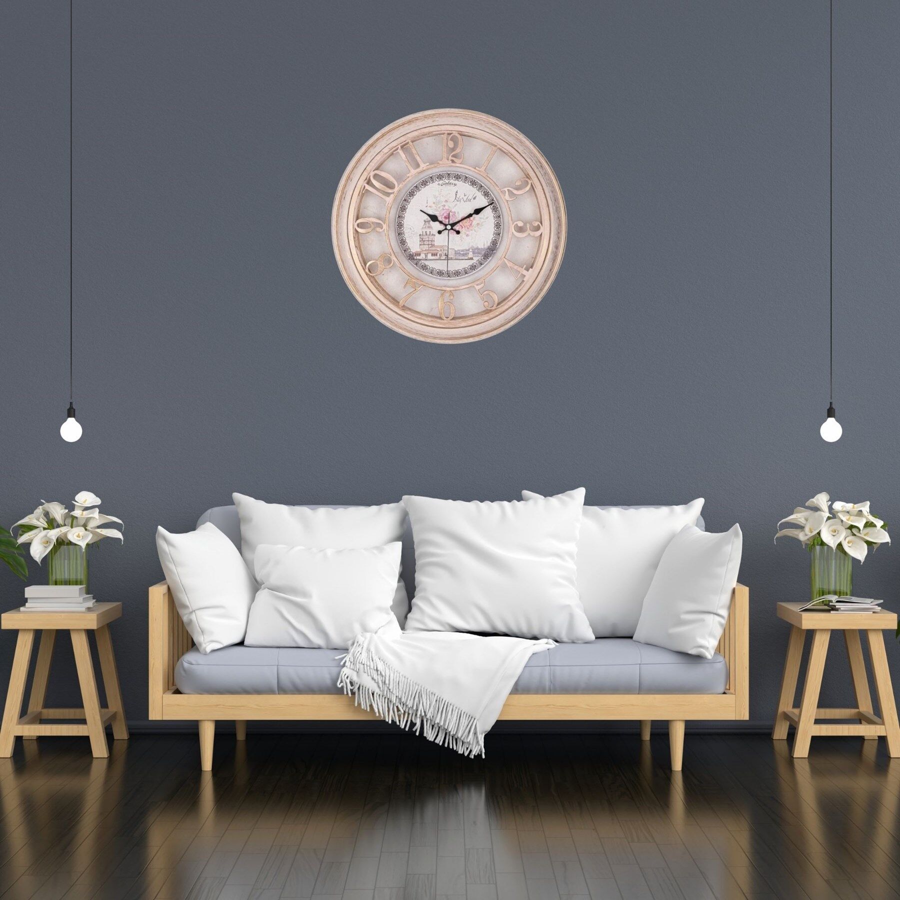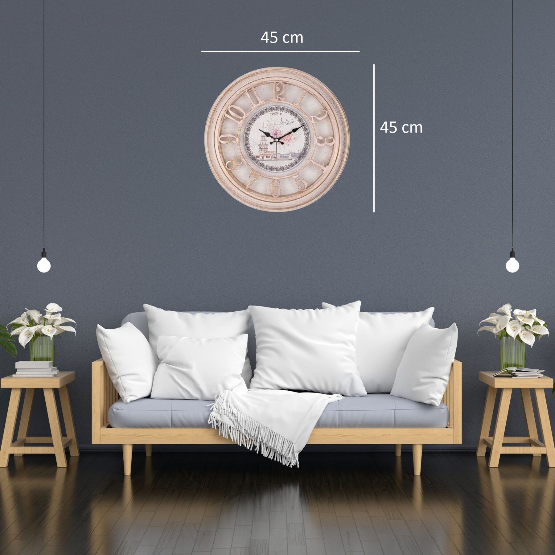 Zarif ve nostaljik tasarımıyla dikkat çeken 45 cm eskitme vintage duvar saati, yaşam alanlarınıza sıcak ve klasik bir atmosfer kazandırır. Eskitme çerçeve tasarımı ve dekoratif rakamları sayesinde özellikle vintage, country ve klasik dekorasyon tarzlarıyla mükemmel uyum sağlar.