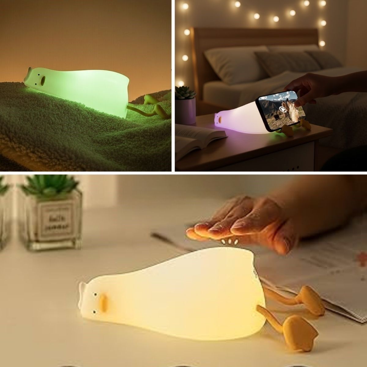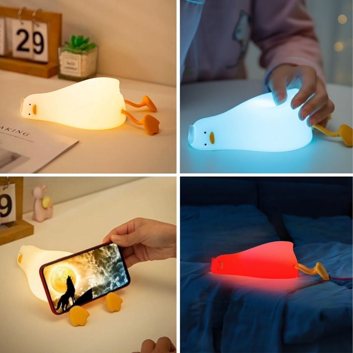 5 Farklı Renk Modlu Tembel Ördek Figürlü Pofuduk LED Gece Lambası, çocuklar için sevimli bir uyku arkadaşı, yetişkinler için ise dekoratif ve fonksiyonel bir ortam ışığıdır. Doğum günü, yeni doğan ve özel günler için hem şık hem de kullanışlı bir hediye alternatifi sunar. Sevimli tasarımı ve yumuşak ışığıyla yaşam alanlarınıza keyifli bir dokunuş katar.
