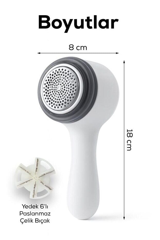 6 Bıçaklı Şarjlı Tüy Ve Tiftik Temizleme Makinesi Beyaz Yuvarlak Tasarım YEDEK BIÇAKLI
