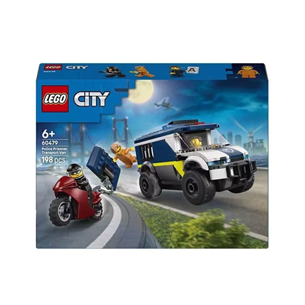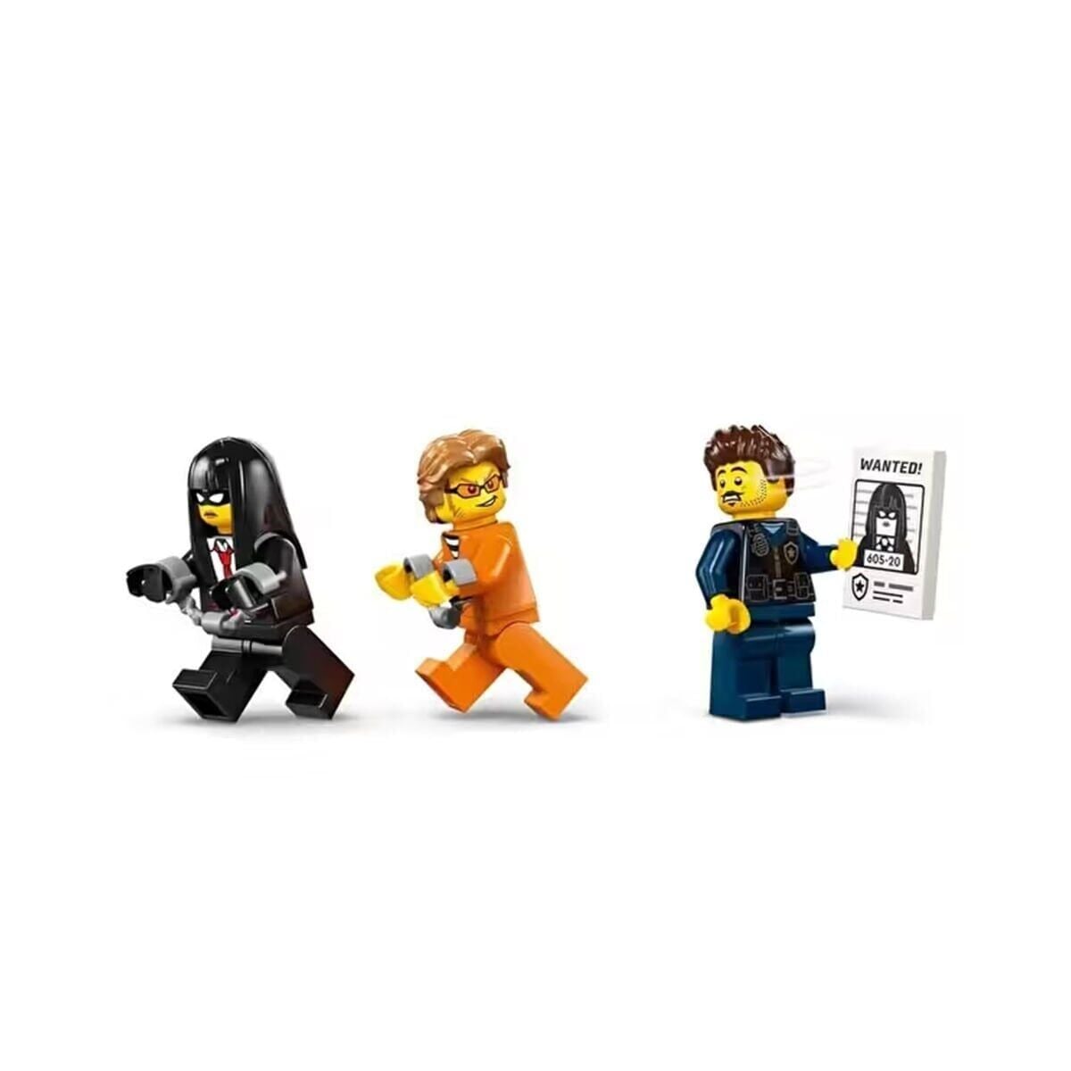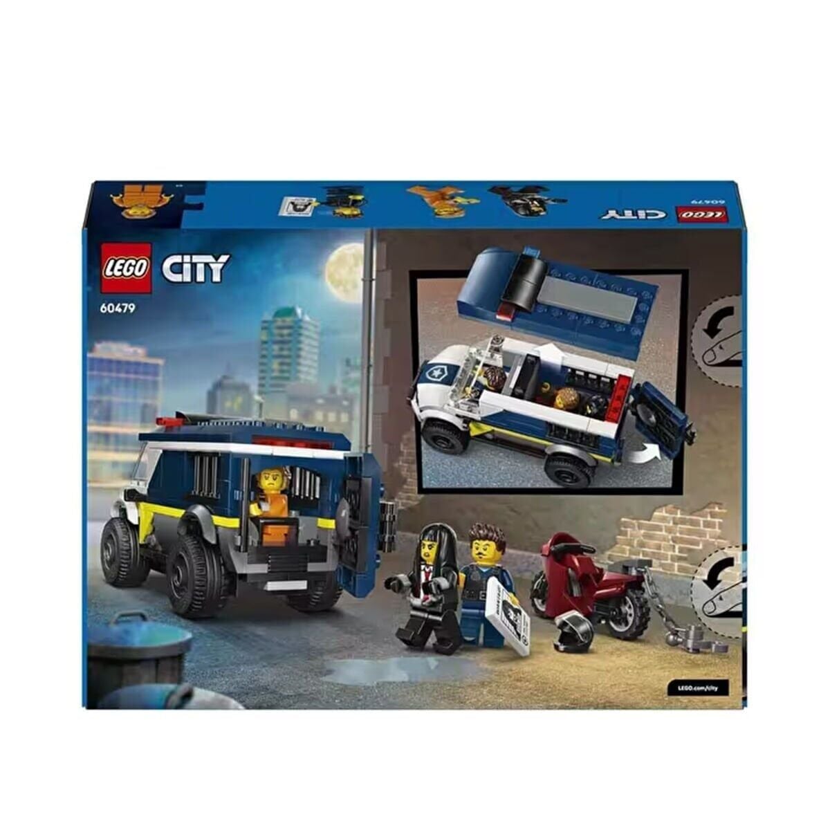 Polis kamyonu modelinde ayrıntılı bir sürücü kabini ve 2 haydutun sığabileceği hapishane hücresi bulunur. Çocuklar, zinciri ve kancası olan oyuncak motosikleti kullanarak hücre kapısını çekebilir. Heyecanlı bir hapishane firar rol oyunu için polis memuru ve 2 haydut mini figürünü eklemeniz yeterli.