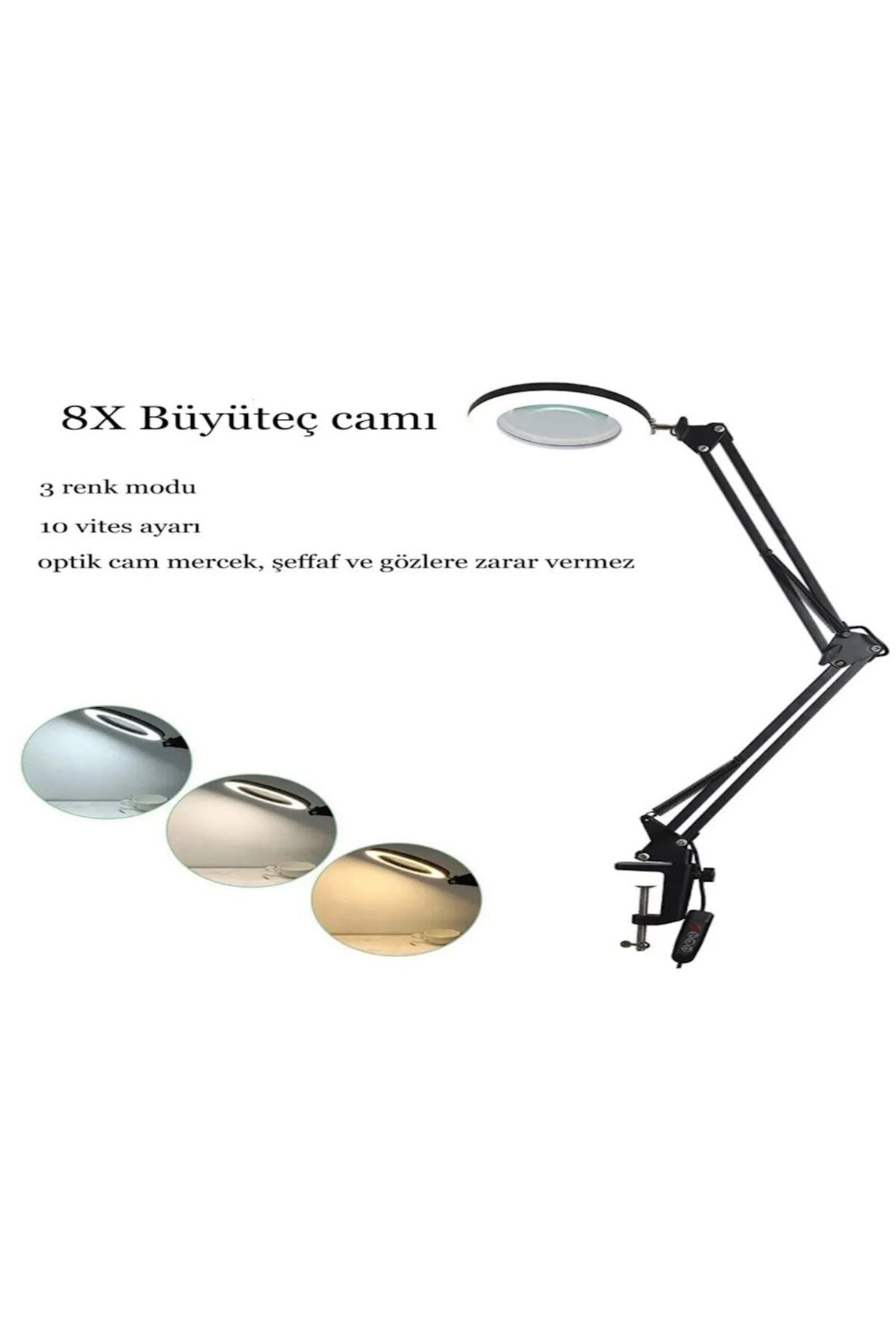 1; 8x Büyüteç Cam:; Bu masalambasının bir özelliği, 8 kat büyüteç cam içermesidir; Bu özellik, detaylıincelemeler veya küçük yazıları daha net görmek için kullanışlı olabilir; 2; Salıncak Kolu ile Esnek:; Lambanın salıncakkolu sayesinde, ışığı istenen yöne çevirmek veya ayarlamak mümkündür; Esneklik,lambanın kullanıcı ihtiyaçlarına uyum sağlamasına yardımcı olur; 3; Kelepçe; On:; Lambanın masaüzerine sabitlenmesini sağlayan bir kelepçe sistemine sahiptir; Bu özellik,lambanın masa üstünde yer kaplamadan kullanılabilmesine olanak tanır; 4; Kısılabilir Işıklı Büyüteç:; Lamba, ışıkşiddetini ayarlamak için kısılabilir bir özellik içerir; Bu sayedekullanıcılar, lambanın aydınlatma seviyesini ihtiyaçlarına göredüzenleyebilirler; 5; LED'ler ile Masa Işığı:; Masa lambası,enerji tasarruflu ve uzun ömürlü LED ışıklar içerir; LED teknolojisi, parlak vehomojen bir ışık kaynağı sağlar; 6; 3 Renk Modları:; Lamba, 3 farklırenk modu sunar; Kullanıcılar, beyaz ışık, doğal ışık ve sıcak ışık gibi farklırenk tonları arasında seçim yapabilirler; Bu özellik, lambanın ortamdaki ışıktonunu kişisel tercihlere göre uyarlamak için ;;