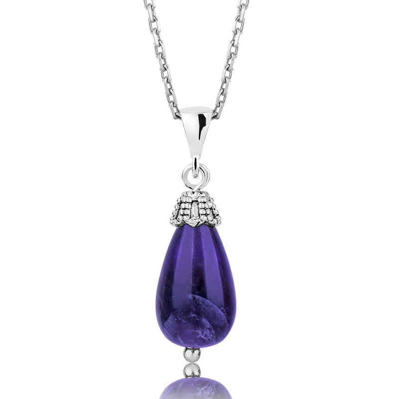 Asırlar boyunca birçok medeniyet tarafından kullanılmış ve günümüze kadar değerini korumuş olan Ametist, hemen her dönem en gözde değerli taşlardan biri olmuştur. Çeşitli kültürlerde “mor yakut”, “mor necef” adlarıyla, kimi zaman da “aşk taşı” olarak tanımlanmıştır. Ametist taşı; tüm değerli taşlar gibi takı, süs ve ziynet eşyalarının yapımında ve oymacılıkta kullanılmaktadır. Takı ve mücevheratta, özellikle şifa ve pozitif enerji verdiğine inanılan koyu mor Ametist öne çıkar. Sadece beden ile temasında değil, taşın bulunduğu ortama yaydığı pozitif enerji de büyük rağbet görmesinde etkilidir. Bu özel taştan imal edilen kolye modelinin metal olan kısımları 925 ayar gümüşten imal edilmiştir. Gümüş üzerine oksit kaplama yapılmıştır. Oksit kaplama yapılan gümüş doğal taşlı kolye modelleri parlaklığını uzun süre muhafaza eder ve oksitlenmesi gecikir. Gümüş olan zincir boyu ortalama 45 cm'dir. Ürünlerimizin tamamında olduğu gibi gümüş ametist taşlı kolye modeli de el emeği ile üretilmiştir. Gümüş ve değerli taşlar nedeniyle ürün ağırlığında ± %10 sapma olabilmektedir.