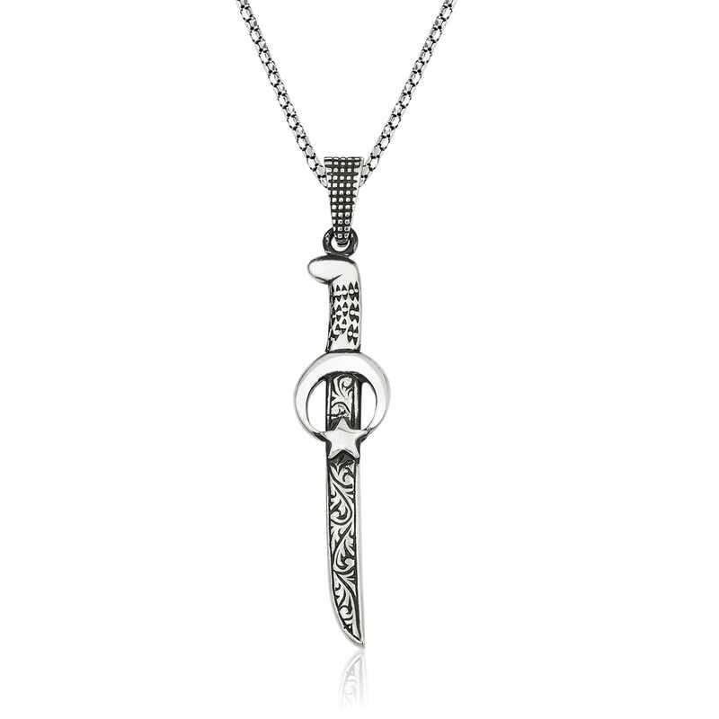 Kılıç tarih boyunca bir çok uygarlık tarafından kullanılmış silahların icadından önce insan oğlunun iktidar gücünü ortaya koyup uygulayabilmesi için kullandığı çeşitli boyutlarda olabilen, keskin kenarlı, sivri uçlu bir silahtır. Kılıcın boyutu tarihler boyunca, farklı uluslarda, farklı boyutlarda olmuştur. Türkler Orta Asya’ya göç edince kılıç yapım merkezleri kurarlar. Kılıç geleneği Selçuklular ve Osmanlı dönemlerinde devam eder. Anadolu kılıçlarını batının kılıçlarından ayıran özellik; eğri, çok su verilmiş ve eğriliklerinden dolayı çok rahat kullanılabilir olmalarıydı. Türkler kılıca, üzerine yemin edilebilecek derecede önem atfederken, demir ve onu eriten ateşin ruhsal bir yönü olduğunu savunmuşlardır. Yetenekli bileklerde kılıç harikalar yaratabilirdi ve Eski Türk uygarlıklarında süvariler, atları ve kılıçları ile gömülmek istemişlerdir. Kılıç, insanın zor bir maden olan demir üzerinde ateşle neler yapabileceğinin en güzel kanıtlarından biridir. Eğer eski zaman kahramanlıkları ilginizi çekiyorsa, yakın temasla mücadeleyi sahici buluyorsanız, sadece bir kılıç kolyeniz eksik demektir. Gümüş Ay Yıldız figürlü kılıç erkek kolye 925 ayar gümüşten imal edilmiştir. Gümüş üzerine eskitme görünüm kazandırmak için oksit kaplama yapılmıştır. Zincir boyu 55 cm'dir. Gümüş ve değerli taşlar nedeniyle ürün ağırlığında ± %10 sapma olabilmektedir.