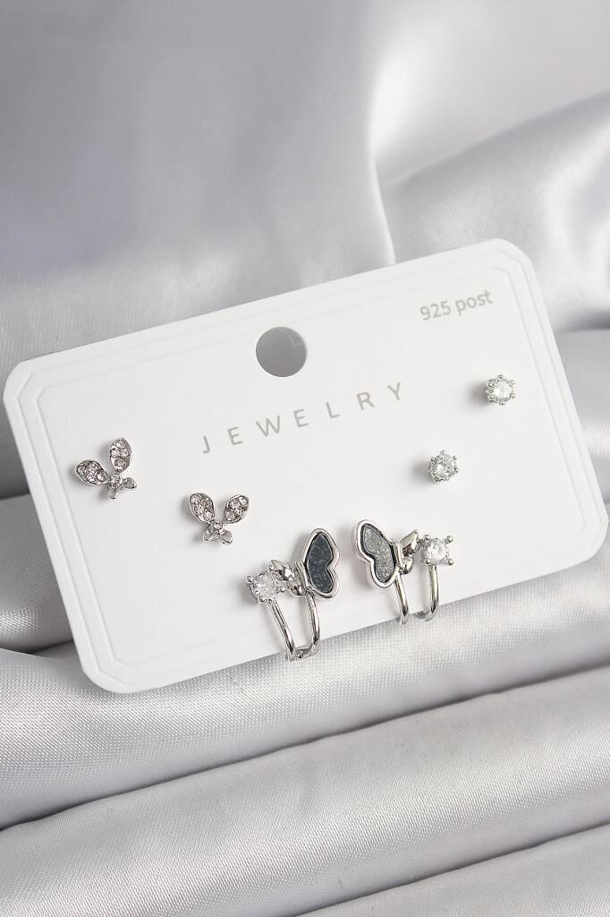 925 Ayar Gümüş Çivi Pirinç Gümüş Renk Zirkon Taşlı Kelebek Model Kadın Küpe Seti - BKP10404 (491491)
