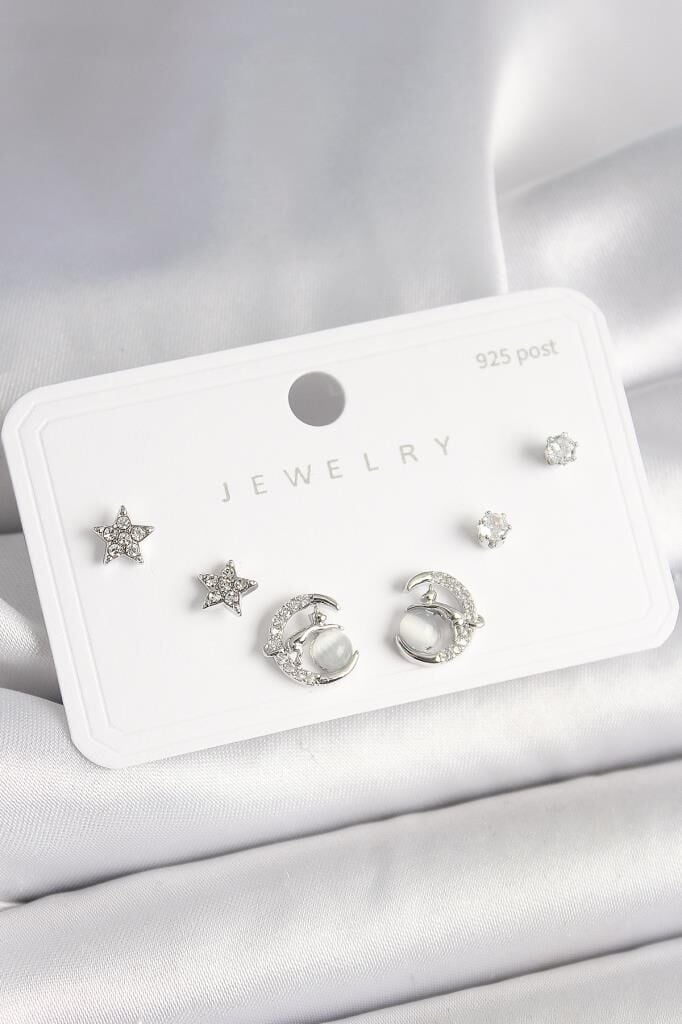 925 Ayar Gümüş Çivi Zirkon Taşlı Hilal Yıldız Model Kadın Küpe Seti - BKP10398 (491491)