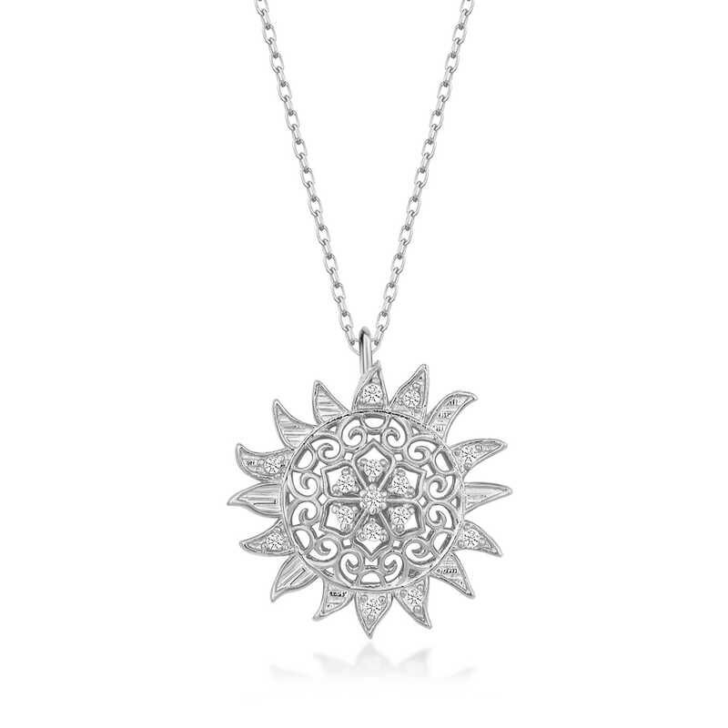 Güneş; ışığın, bilginin, iyiliğin, gücün ve yönetimin sembolüdür. Bu ışıl ışıl ve farklı tasarımıyla göz kamaştıran kolye; 925 ayar gümüşten imal edilmiştir. Gümüş üzerine rodyum kaplama yapılmıştır. Rodyum kaplama yapılan gümüş ürünler parlaklığını uzun süre muhafaza eder, oksitlenmesi gecikir. Gümüş beyaz taşlı güneş kadın kolye üzerinde bulunan taşlar zirkon'dur. Tüm gümüş kolyelerde olduğu gibi gümüş güneş kadın kolye de tamamı el emeği ile üretilmiştir. Gümüş ve değerli taşlar nedeniyle belirtilen ortalama ürün ağırlığında ± %10 sapma olabilmektedir.