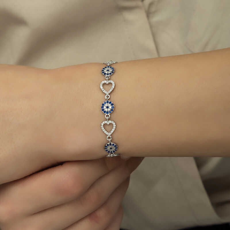 Aşkı bütün saflığı, doğallığı ve içtenliğiyle anlatmanın yoludur kalp... Sonsuz aşkı anlatmak için oluşturulan bu özel tasarımı sevgilinize doğum günü, sevgililer günü yada özel günlerde hediye ederek onları mutlu edebilirsiniz... Bu aşk dolu bileklik 925 ayar gümüşten üretilmiştir. Gümüş kalpli nazar bayan bileklik üzerinde bulunan taşlar zirkondur. Bu bayan gümüş bileklik üzerine rodyum kaplama yapılmıştır. Rodyum kaplama yapılan bileklikler parlaklığını uzun süre muhafaza eder ve oksitlenmesi gecikir. Tüm gümüş bileklik modellerinde olduğu gibi bu gümüş kalpli nazar bayan bileklik modeli de tamamen el emeği ile üretilmiştir. Gümüş ve değerli taşlar nedeniyle belirtilen ortalama ürün ağırlığında ± %10 sapma olabilmektedir.