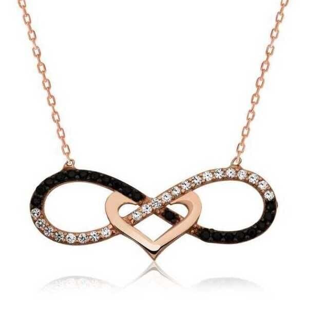Sevgilinize sonsuz aşkı ifade etmenin en güzel, en anlamlı yollarından biri de ona sonsuzluk temalı gümüş takılar hediye etmektir. Sevgilinize hediye edeceğiniz bu özel kolye ile ona olan sonsuz aşkınızı sevginizi ifade edebilir sonsuza kadar birlikte olacağınız mesajı verebilirsiniz. Sonsuzluk kolye modeli 925 ayar gümüşten imal edilmiştir. Gümüş üzerine rose kaplama yapılmıştır. Rose kaplama yapılan gümüş kolye modelleri parlaklığını uzun süre muhafaza eder , gümüşü pembe rengine çevirir ve oksitlenmesi gecikir. Kolye üzerinde bulunan siyah taşlar zirkondur. Gümüş olan zincirin boyu ortalama 45 cm'dir. Tüm gümüş kolye modellerinde olduğu gibi gümüş kalpli sonsuzluk kolye modeli de el emeği ile üretilmiştir. Gümüş ve değerli taşlar nedeniyle belirtilen ortalama ürün ağırlığında ± %10 sapma olabilmektedir.