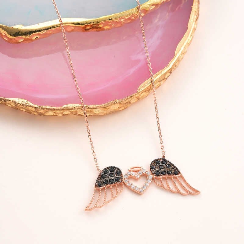Sevdiğinizin kalbinin kanatlarınızın altında olduğunu anlatan siyah kanatlı melek kolye, duygularınızı ifade etmenizde yardımcı olacak en güzel aksesuarlardan biri olacaktır. Sevdiklerinizi sevindirebileceğiniz en anlamlı hediyelerden kanatlı melek kadın kolye 925 ayar gümüşten imal edilmiştir. Gümüş üzerine rose kaplama yapılmıştır. Rose kaplama yapılan gümüş kadın kolye modelleri parlaklığını uzun süre muhafaza eder ve oksitlenmesi gecikir. Kolye üzerinde bulunan siyah taşlar zirkondur. Gümüş olan zincir boyu ortalama 45 cm'dir. Gümüş kanatlı melek kadın kolye el emeği ile üretilmiştir. Gümüş ve değerli taşlar nedeniyle belirtilen ortalama ürün ağırlığında ± %10 sapma olabilmektedir.