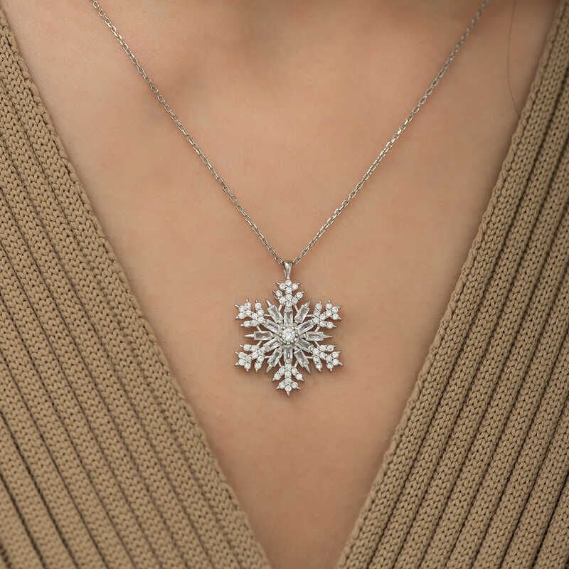Kadınların ışıltısı, berraklığı kar tanesine benzetilip özel olarak tasarlanmıştır. Kar tanelerinin her birinin kadınlar gibi eşsiz ve ayrı kıymette olması onları özel kılan bir diğer özelliktir. Asilliği her dönemde dikkat çekmeyi başarmıştır. Bunun yanında insanların tıpkı kar taneleri gibi birbirlerine zarar vermeden de mutlu bir şekilde yaşayabileceklerini sembolize etmektedir. Bu şık kolye; doğum günü hediyesi, sevgililer günü hediyesi veya annelere hediye olarak özel günlerde tercih edilebilecek mükemmel bir seçenektir. Kolye, 925 ayar gümüşten imal edilmiştir. Gümüş üzerine rodyum kaplama yapılmıştır. Rodyum kaplama yapılan ürünler parlaklığını uzun süre muhafaza eder ve oksitlenmesi gecikir. Tüm gümüş kolyelerde olduğu gibi bu gümüş kar tanesi kolye de tamamı el emeği ile üretilmiştir. Gümüş ve değerli taşlar nedeniyle belirtilen ortalama ürün ağırlığında ± %10 sapma olabilmektedir.