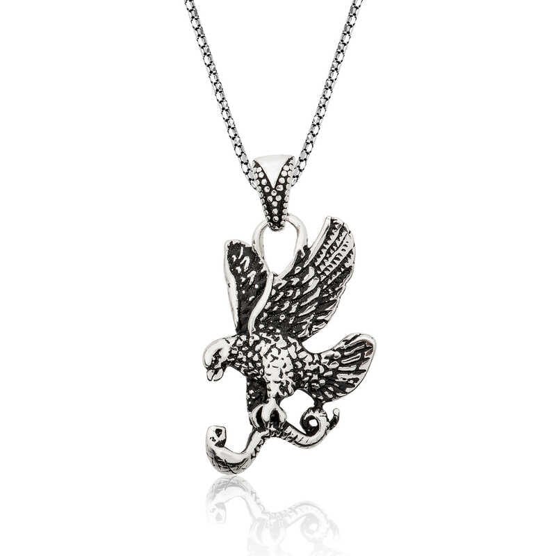 Kuşların kralı olan ve savaşmak üzere dünyaya inen kartal, özellikle savaşçı ve güçlü olmasıyla tanınır; bu yüzden pek çok ulusun sembolü olmuştur. Bu derin anlamdan esinlenerek oluşturulan kartal erkek kolye; kendinize yada sevdiklerinize doğum gününde, babalar gününde yada özel günlerde hediye edebilirsiniz. Bu şık erkek kolye; 925 ayar gümüşten imal edilmiştir. Gümüş üzerine oksit kaplama yapılmıştır. Oksit kaplama yapılan kolyeler parlaklığını uzun süre muhafaza eder. Tüm erkek kolyelerde olduğu gibi gümüş kartal erkek kolye de el emeği ile üretilmiştir. Gümüş ve değerli taşlar nedeniyle belirtilen ortalama ürün ağırlığında ± %10 sapma olabilmektedir.