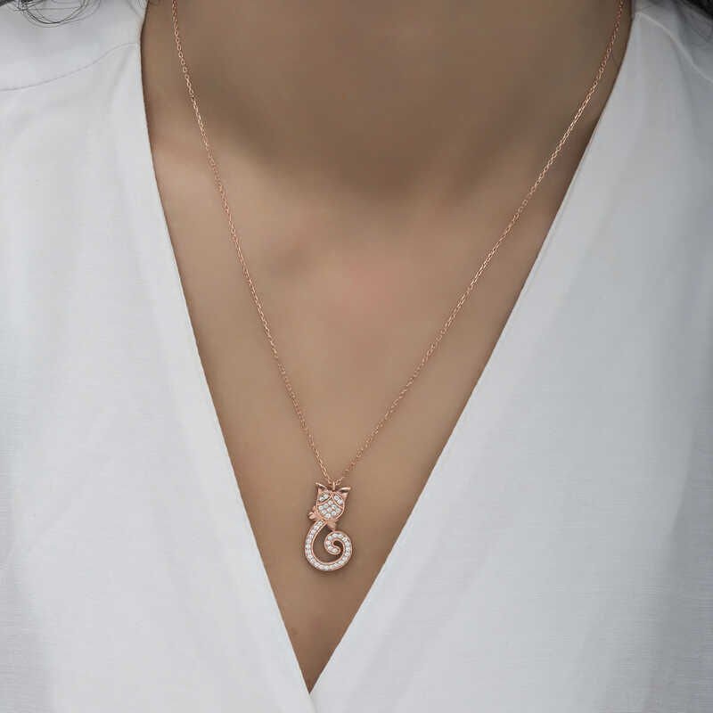 Evlerimizin sevimli neşe kaynağı kediler, temiz olmalarının yanı sıra masumiyetin simgesidir. Asil ve mantıklı bir kişiliğe, mükemmel sezgilere ve akılcı bir duyarlılığa sahiptirler. Özel günlerin en tercih edilen hediye seçeneklerinden olan gümüş takılar, sevdiklerini mutlu etmek ve onlara her an yanlarında taşıyabilecekleri bir hediye vermek isteyenler için tasarlandı. Masumiyetin simgesi olan kedi figürlü gümüş kolye modelini kız kardeşinize, sevgilinize ya da arkadaşlarınıza armağan edebilirsiniz. Zirkon taşlı kedi kadın kolye modeli 925 ayar gümüşten imal edilmiştir. Gümüş üzerine rose kaplama yapılmıştır. Rose kaplama yapılan gümüş kedi kolye modelleri parlaklığını uzun süre muhafaza eder ve oksitlenmesi gecikir. Kolye üzerinde bulunan tüm taşlar zirkondur. Gümüş olan zincir boyu ortalama 45 cm'dir. Gümüş kadın kedi kolye diğer tüm gümüş kadın kolye modellerinde olduğu gibi el emeği ile üretilmiştir. Gümüş ve değerli taşlar nedeniyle belirtilen ortalama ürün ağırlığında ± %10 sapma olabilmektedir.