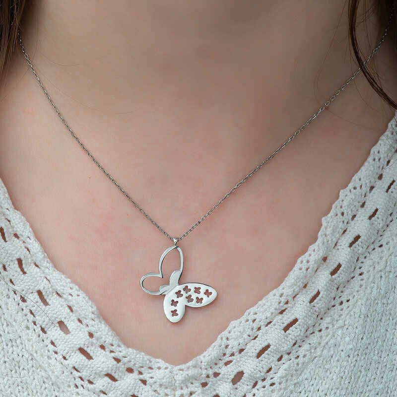 Kelebek; kadınlarca tercih edilen en popüler motiflerden biridir. Sevenlerine doğanın gizemini ve insan hayal gücünün zenginliğini hatırlatır. Özgürlüğü masumiyeti ve saflığı simgeleyen kelebekler, tertemiz sevginin ve aşkın ifadesidir. Sizin olduğu kadar sevdiklerinizin de keyifle takacağı kelebek kolye, sevdiğinize en güzel hediyelerden biri olacaktır. Kolye 925 ayar gümüşten imal edilmiştir. Gümüş üzerine rodyum kaplama yapılmıştır. Rodyum kaplama yapılan gümüş kolyeler parlaklığını uzun süre muhafaza eder ve oksitlenmesini geciktirir. Gümüş olan zincir boyu ortalama 45 cm'dir. Tüm gümüş kolyelerde olduğu gibi gümüş pembe kelebek kolye modeli de el emeği ile üretilmiştir. Gümüş ve değerli taşlar nedeniyle belirtilen ortalama ürün ağırlığında ± %10 sapma olabilmektedir.