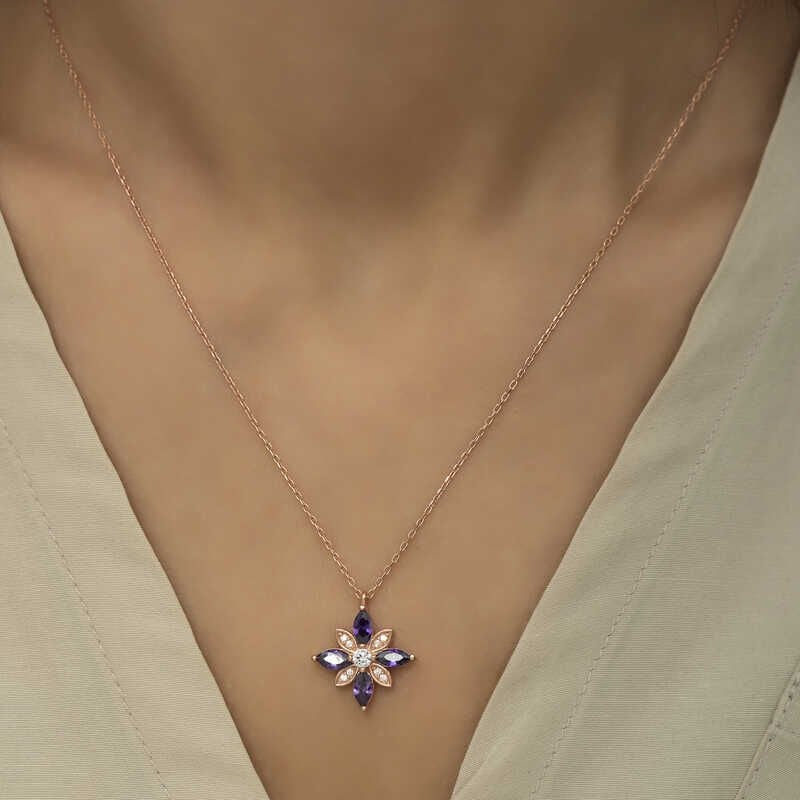 Gümüş Mor Taşlı Umut Çiçeği Kolye