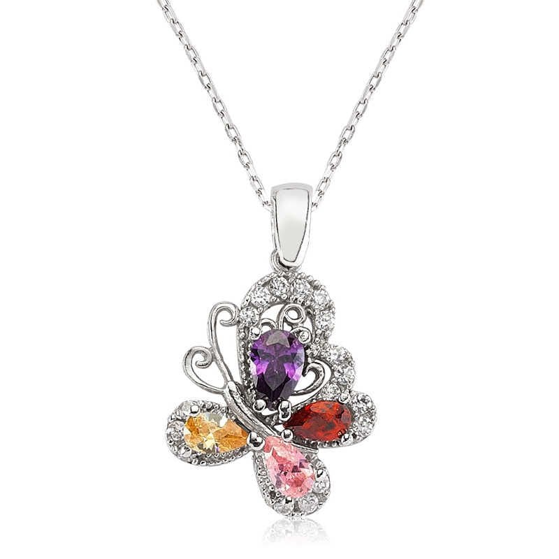 Kelebek tertemiz sevginin, saflığın ve aşkın ifadesidir. Minicik bir tırtılken kendi ördükleri kozanın içerisine girip sabırla bekledikten sonra bambaşka bir görünüm ve güzellik ile kelebeğe dönüşüm yaşanması renkli kelebek kolye modelleri için de ilham kaynağı olmuştur. Renkli kelebek kolye aşkın küçük bir kıvılcım ile başladığı daha sonra büyük bir sabır ile büyüdüğü ve en sonunda kozasından çıkarak ilan-ı aşk edilmesidir. Sizin olduğu kadar sevdiklerinizin de keyifle takacağı gümüş renkli kelebek kolye modeli sevgiliye en güzel hediyelerden biri olacaktır. Renkli kelebek kolye modeli 925 ayar gümüşten imal edilmiştir. Gümüş üzerine rodyum kaplama yapılmıştır. Rodyum kaplama yapılan gümüş kolye modelleri parlaklığını uzun süre muhafaza eder ve oksitlenmesi gecikir. Kolye üzerinde bulunan tüm taşlar zirkondur. Gümüş olan zincir boyu ortalama 45 cm'dir. Bu renkli kelebek kolye de diğer gümüş kolye modelleri gibi el emeği ile üretilmiştir. Gümüş ve değerli taşlar nedeniyle belirtilen ortalama ürün ağırlığında ± %10 sapma olabilmektedir.