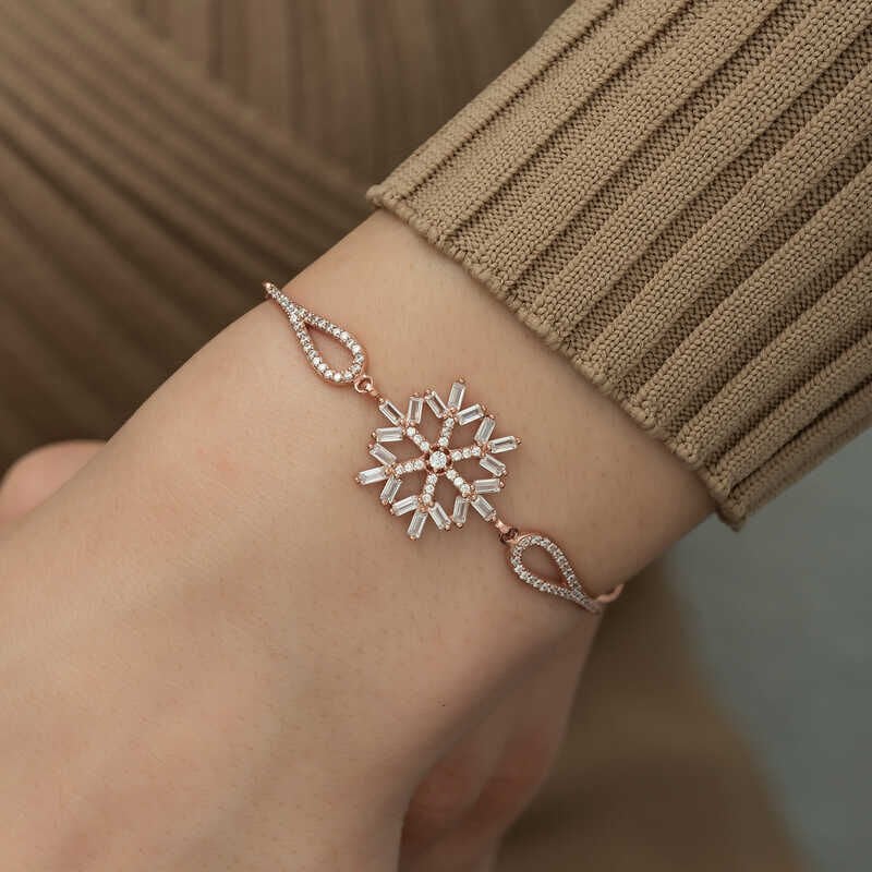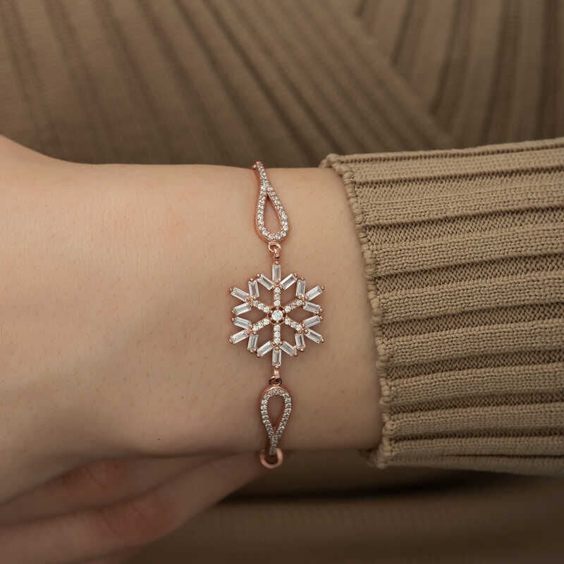 Kadınların ışıltısı, berraklığı kar tanesine benzetilip özel olarak tasarlanmıştır. Kar tanelerinin her birinin bayanlar gibi eşsiz ve ayrı kıymette olması onları özel kılan bir diğer özelliktir. Asilliği her dönemde dikkat çekmeyi başarmıştır. Bunun yanında insanların tıpkı kar taneleri gibi birbirlerine zarar vermeden de mutlu bir şekilde yaşayabileceklerini sembolize etmektedir. Bu şık bileklik; doğum günü hediyesi, sevgililer günü hediyesi veya annelere hediye olarak özel günlerde tercih edilebilecek mükemmel bir seçenektir. Bileklik, 925 ayar gümüşten imal edilmiştir. Gümüş üzerine rose altın kaplama yapılmıştır. Rose altın kaplama yapılan ürünler parlaklığını uzun süre muhafaza eder ve oksitlenmesi gecikir. Tüm gümüş bayan bilekliklerde olduğu gibi bu gümüş rose baget taşlı kar tanesi bayan bileklik de tamamı el emeği ile üretilmiştir. Gümüş ve değerli taşlar nedeniyle belirtilen ortalama ürün ağırlığında ± %10 sapma olabilmektedir.