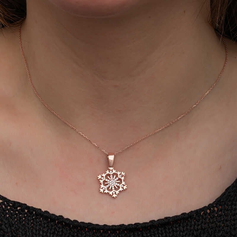 Kadınların ışıltısı, berraklığı kar tanesine benzetilip özel olarak tasarlanmıştır. Kar tanelerinin her birinin kadınlar gibi eşsiz ve ayrı kıymette olması onları özel kılan bir diğer özelliktir. Asilliği her dönemde dikkat çekmeyi başarmıştır. Bunun yanında insanların tıpkı kar taneleri gibi birbirlerine zarar vermeden de mutlu bir şekilde yaşayabileceklerini sembolize etmektedir. Bu şık kolye; doğum günü hediyesi, sevgililer günü hediyesi veya annelere hediye olarak özel günlerde tercih edilebilecek mükemmel bir seçenektir. Kolye, 925 ayar gümüşten imal edilmiştir. Gümüş üzerine rose kaplama yapılmıştır. Rose kaplama yapılan gümüş kadın kolye modelleri parlaklığını uzun süre muhafaza eder, oksitlenmesi gecikir. Zincir boyu ortalama 45 cm'dir. Tüm gümüş kadın kolye modellerinde olduğu gibi bu gümüş kar tanesi kadın kolye de tamamı el emeği ile üretilmiştir. Gümüş ve değerli taşlar nedeniyle belirtilen ortalama ürün ağırlığında ± %10 sapma olabilmektedir.