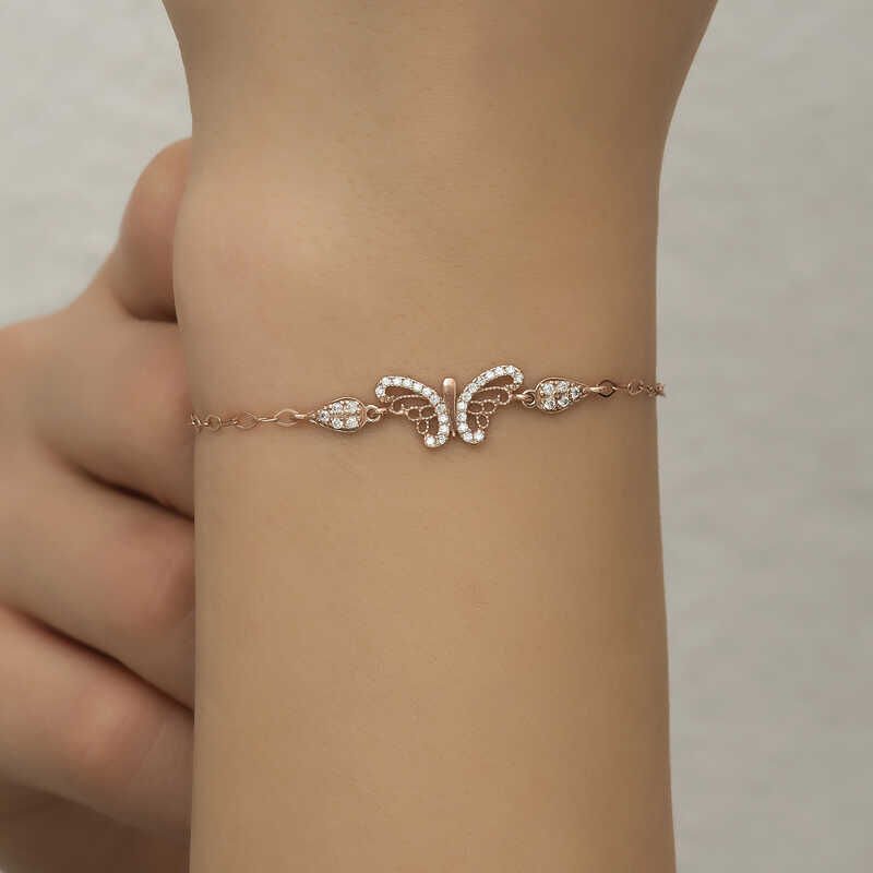 Kelebek simgesi; huzur, mutluluk, gençlik ve romantizm duygularının tekrar canlanması, temiz ve saf bir sevgi değeri taşımaktadır. Kadınların genellikle kolye ve bilekliklerde kullandıkları son derece zarif görüntü sunan kelebek modelleri; Yunan ve Uzak Doğu takı dünyasında popüler bir yer almakta, bedenin olgunlaşması temsil etmektedir. Psikolojik olarak ise kelebek modelleri için ruhun değişimi ve yenilenmesi olarak anlatılmaktadır. Bu şık bileklik; doğum günü hediyesi, sevgililer günü veya özel günlerde tercih edilebilecek mükemmel bir seçenektir. Bileklik 925 ayar gümüşten üretilmiştir. Gümüş üzerine rose kaplama yapılmıştır. Rose kaplama yapılan kadın bileklikler parlaklığını uzun süre muhafaza eder ve oksitlenmeyi geciktirir. Tüm gümüş bilekliklerde olduğu gibi gümüş kelebek bileklik de el emeği ile üretilmiştir. Üzerinde bulunan taşlar zirkondur. Gümüş ve değerli taşlar nedeniyle belirtilen ürün ağırlığında ± %10 sapma olabilmektedir.