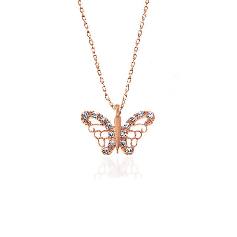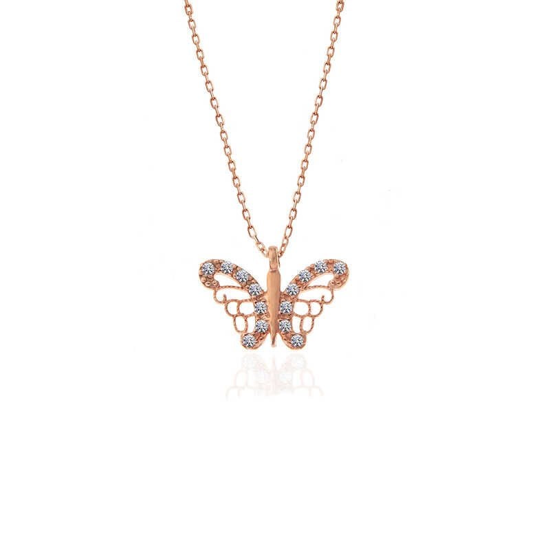 Kelebek; kadınlarca tercih edilen en popüler motiflerden biridir. Sevenlerine doğanın gizemini ve insan hayal gücünün zenginliğini hatırlatır. Özgürlüğü masumiyeti ve saflığı simgeleyen kelebekler, tertemiz sevginin ve aşkın ifadesidir. Sizin olduğu kadar sevdiklerinizin de keyifle takacağı kelebek kadın kolye, sevdiğinize en güzel hediyelerden biri olacaktır. Kolye 925 ayar gümüşten imal edilmiştir. Gümüş üzerine rose kaplama yapılmıştır. Rose kaplama yapılan gümüş kadın kolyeler parlaklığını uzun süre muhafaza eder ve oksitlenmesini geciktirir. Gümüş olan zincir boyu ortalama 45 cm'dir. Tüm gümüş kadın kolyelerde olduğu gibi gümüş kelebek kadın kolye modeli de el emeği ile üretilmiştir. Gümüş ve değerli taşlar nedeniyle belirtilen ortalama ürün ağırlığında ± %10 sapma olabilmektedir.
