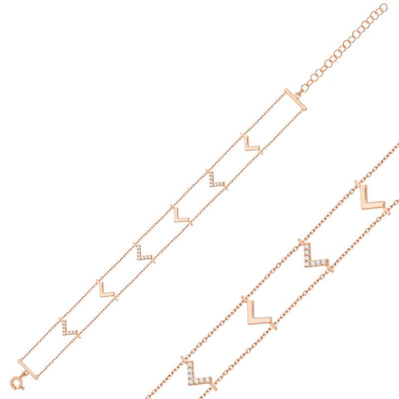 Şık ve fantezi görünümü seven kadınlar için ideal bir seçenek. Koleksiyonlarda; gösteriş ve şıklığın peşinde olan kadınlar için taşlı ve taşsız v sembollerden oluşan çift zincirli bileklik her zevke ve konsepte uygun modeli ile sizleri bekliyor. Bu şık bileklik modeli 925 ayar gümüşten imal edilmiştir. Gümüş üzerine rose altın kaplama yapılmıştır. Rose altın kaplama yapılan gümüş bileklik modelleri parlaklığını uzun süre muhafaza eder, gümüş rengini pembe renge dönüştürür ve oksitlenmeyi geciktirir. Üzerinde bulunan taşlar zirkondur. Gümüş bayan bileklik modellerinin tamamında olduğu gibi gümüş v bayan bileklik modeli de el emeği ile üretilmiştir. Gümüş ve değerli taşlar nedeniyle belirtilen ortalama ürün ağırlığında ± %10 sapma olabilmektedir.