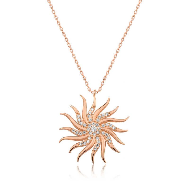 Rüzgar gülü desenli zirkon taşlar ile tasarlanmış şık ve ışıltılı modern kolye günün her anında severek kullanabileceğiniz, herkesin beğenisini toplayabilecek ve göz kamaştırabilecek bir üründür. Bu şık rüzgar gülü kolye; doğum günü hediyesi, sevgililer günü hediyesi veya annelere hediye olarak özel günlerde tercih edilebilecek mükemmel bir seçenektir. Gümüş rüzgar gülü kolye 925 ayar gümüşten imal edilmiştir. Bu kolye üzerinde rose altın kaplama yapılmıştır. Rose altın kaplama yapılan gümüş rüzgar gülü kolye modelleri parlaklığını uzun süre muhafaza eder. Ürünlerimizin tamamı el emeği ile üretilmiştir. Gümüş ve değerli taşlar nedeniyle belirtilen ortalama ürün ağırlığında ± %10 sapma olabilmektedir.