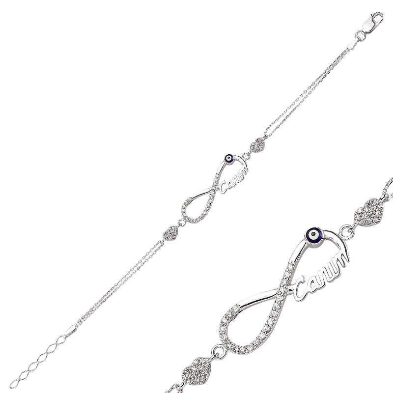 Sevgilinize sonsuz aşkı ifade etmenin en güzel, en anlamlı yollarından biri tabi ki sonsuzluk sembolüdür... Sevgilinize hediye edeceğiniz bu anlamlı gümüş bileklik ile ona olan sonsuz aşkınızı ve sevginizi ifade edebilir sonsuza kadar birlikte olacağınız mesajı verebilirsiniz. Sonsuzluk canım bileklik 925 ayar gümüşten imal edilmiştir. Gümüş üzerine rodyum kaplama yapılmıştır. Rodyum kaplama yapılan ürünler parlaklığını uzun süre muhafaza eder, oksitlenmesi gecikir. Gümüş sonsuzluk canım bayan bileklik üzerinde bulunan taşlar zirkondur. Tüm bayan bilekliklerde olduğu gibi gümüş sonsuzluk canım bayan bilekliğin tamamı da el emeği ile üretilmiştir. Gümüş ve değerli taşlar nedeniyle belirtilen ortalama ürün ağırlığında ± %10 sapma olabilmektedir.