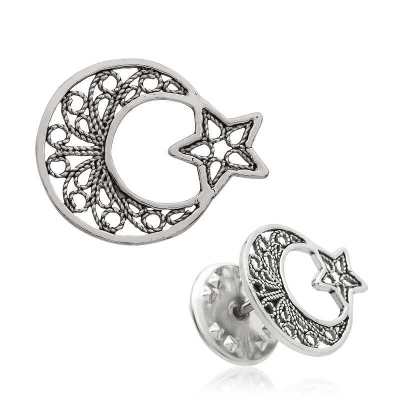 Türk bayrağının ilhamını da kan gölüne yansıyan ay ve yıldızdan aldığını biliyoruz. Bayrağın taşıdığı kutsal anlamı yakanızda ve her anınızda taşımak, sevdiklerinizle paylaşmak için kaçırılmayacak bir fırsat sunuyoruz. Doğum günü hediyesi, babalar günü veya özel günlerde tercih edilebilecek mükemmel bir seçenektir.Bu şık rozet; 925 ayar gümüşten imal edilmiştir. Gümüş üzerine oksit kaplama yapılmıştır. Tüm gümüş rozetlerde olduğu gibi gümüş telkari ay yıldız rozet de tamamı el emeği ile üretilmiştir. Gümüş ve değerli taşlar nedeniyle belirtilen ortalama ürün ağırlığında ± %10 sapma olabilmektedir.