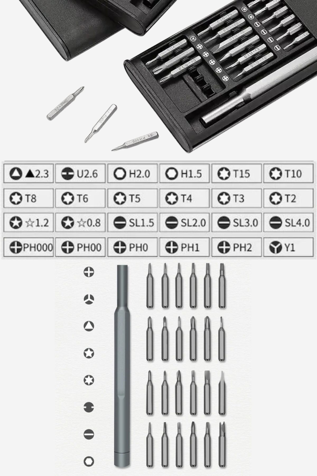 - 24 Farklı Tornavida Ucu: Çeşitli başlık seçenekleriyle telefon, bilgisayar, gözlük, saat, küçük cihazlar ve daha fazlası için uygundur.