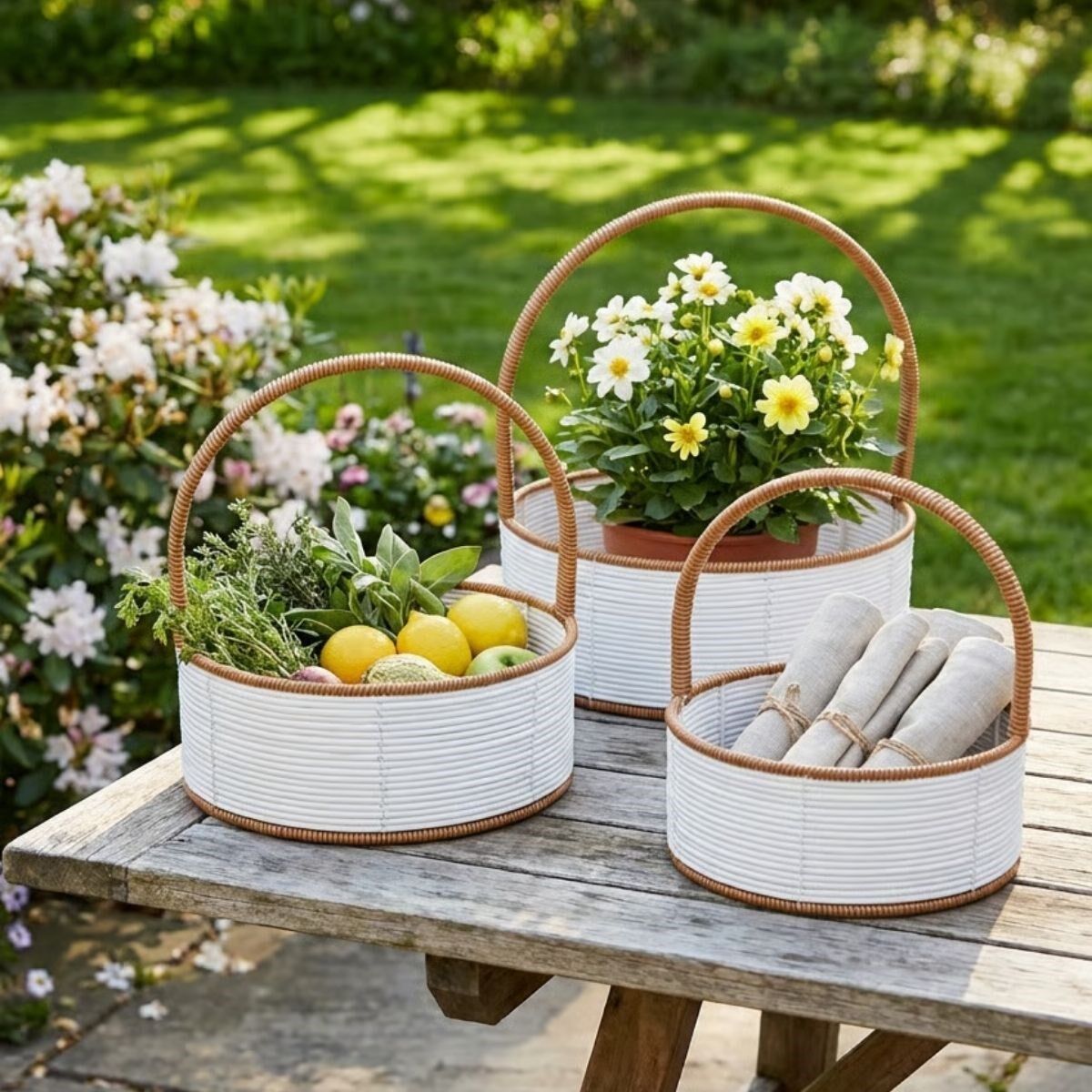AD 3 Boy İç İçe Geçebilen Plastik Rattan Sepetler – Beyaz Renkli, Kahverengi Saplı, Çok Amaçlı Düzenleyici ve Sunum Sepeti Seti