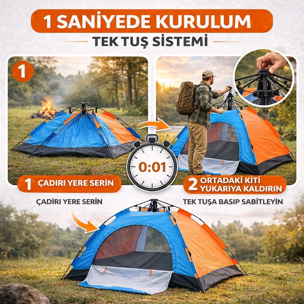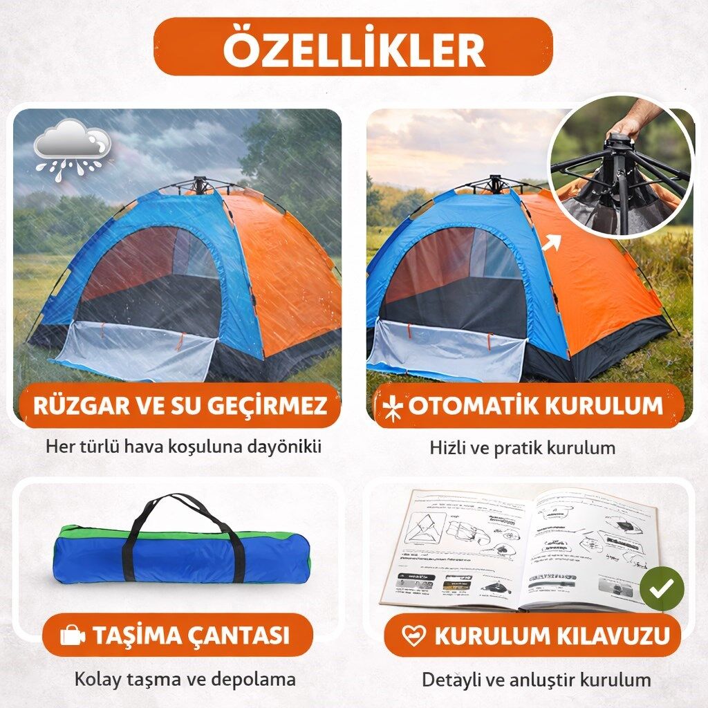 Otomatik kurulum sistemi sayesinde çadır saniyeler içinde kolayca kurulabilir. Kilitlemeli mekanizması güvenli ve sağlam bir kullanım sunar.