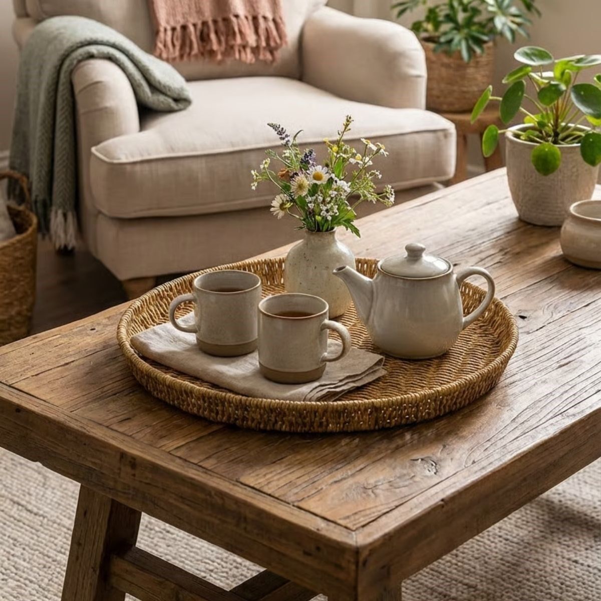 AD 40 cm Plastik Rattan Tepsi – Hasır Görünümlü Dekoratif Servis Tepsisi, Mutfak, Kahvaltı, Sunum ve Masaüstü Çok Amaçlı Organizer