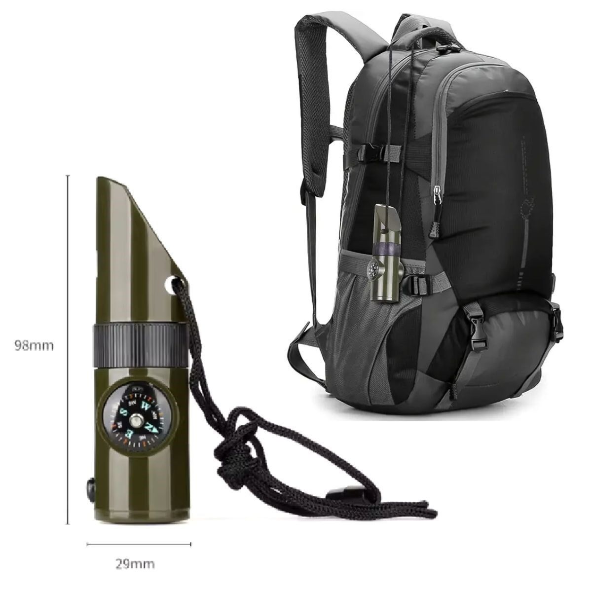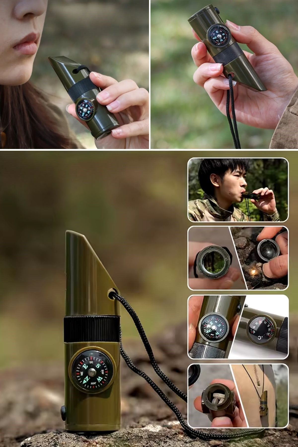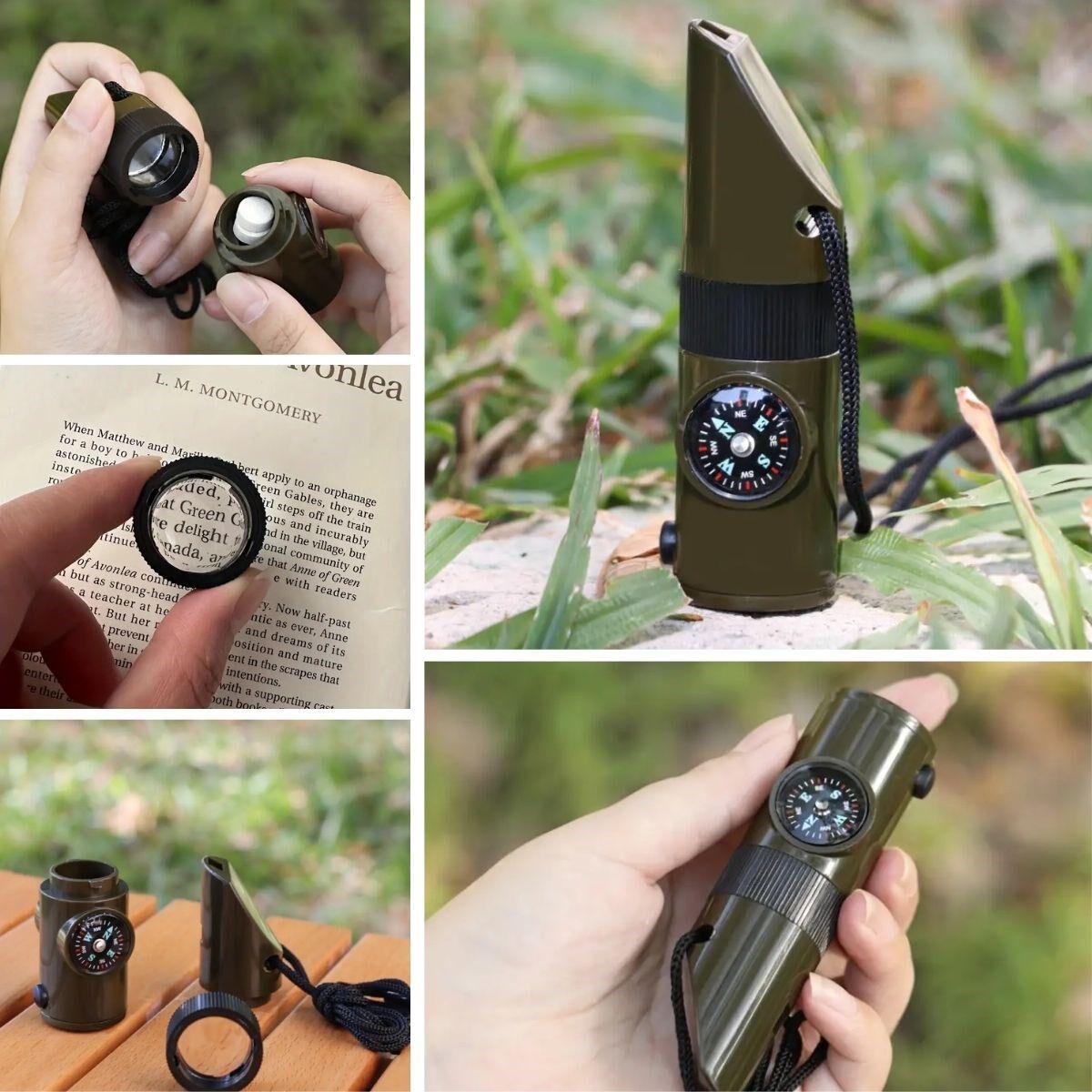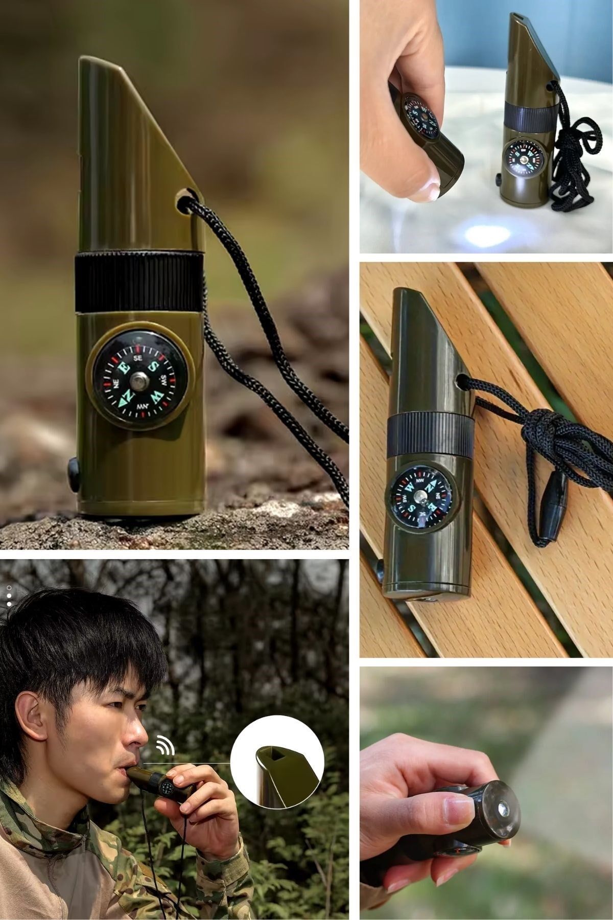 AD7si 1arada Acil Durum Düdüğü,El Feneri, Termometre,Pusula,Büyüteç,Depolama Bölmeli Kampçı Düdüğü