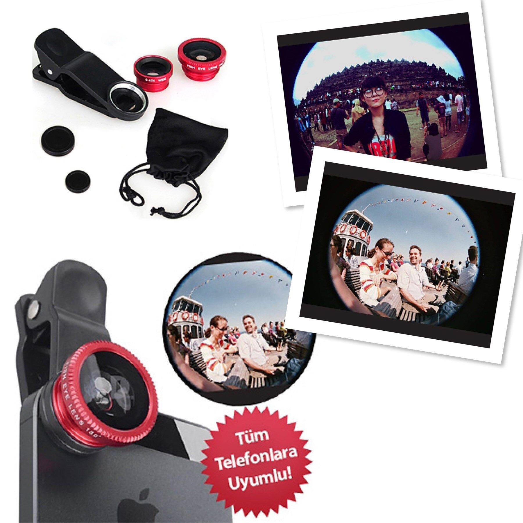 Son dönemde birçok sosyal paylaşım sitesinde arkadaşlarınızın paylaştığı fish eye görüş açısıyla çekilmiş fotoğrafları fark etmişsinizdir Peki ama nasıl bu görüş açısını yakalıyorlar? Tabi ki Universal Geniş Açılı Lens Fish Eye ile! Tüm akıllı telefonlar ile uyumlu lensler sayesinde, ister seyahat ettiğiniz yerlerde isterseniz de arkadaş grubunuz ile harika kareler yakalamak artık mümkün Paket içeriğindeki 3 adet lens ile farklı görüntüler yakalayabilir ve bu görüntüleri arkadaşlarınızla paylaşabilirsiniz Son derece kolay kullanıma sahip lensleri paket içeriğine dahil lens mandalı ile tüm akıllı telefonlarda kullanabilirsiniz Kullanım Talimatı: Lens mandalını telefonunuzun kamerasına denk gelecek şekilde yerleştirin Kullanmak istediğiniz lensi lens mandalına çevirerek takın Ürün Özellikleri: 2 adet farklı lens (fish eye- macro wide) Lens mandalı ile akıllı telefonlara uyumlu Kolay kullanım ve taşınabilme özelliği Paket İçeriği: 1 Adet Wide Lens 1 Adet Fish Eye Lens 1 Adet Micro Lens 1 Adet Lens Mandalı 1 Adet Lens Kılıfı Not: Ürün Karışık Renklerde Gönderilecektir Micro ve Wide Lensler birbirine monte haldedirWide lens Micro lens ile beraber kullanılır Micro Lens kullanımı için lensleri çevirerek birbirinden ayırmanız gerekmektedir En:8 Boy:11 Derinlik:2